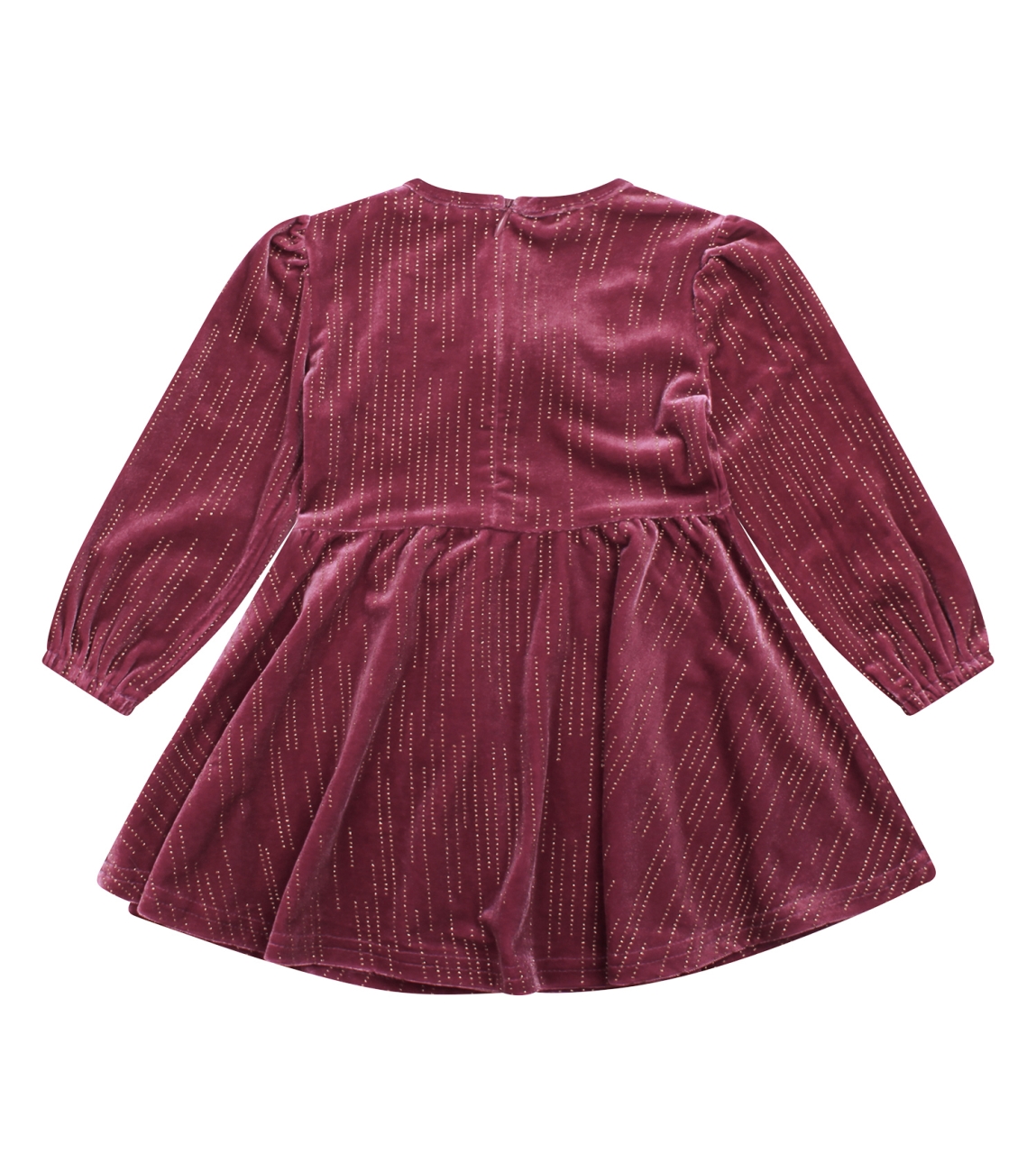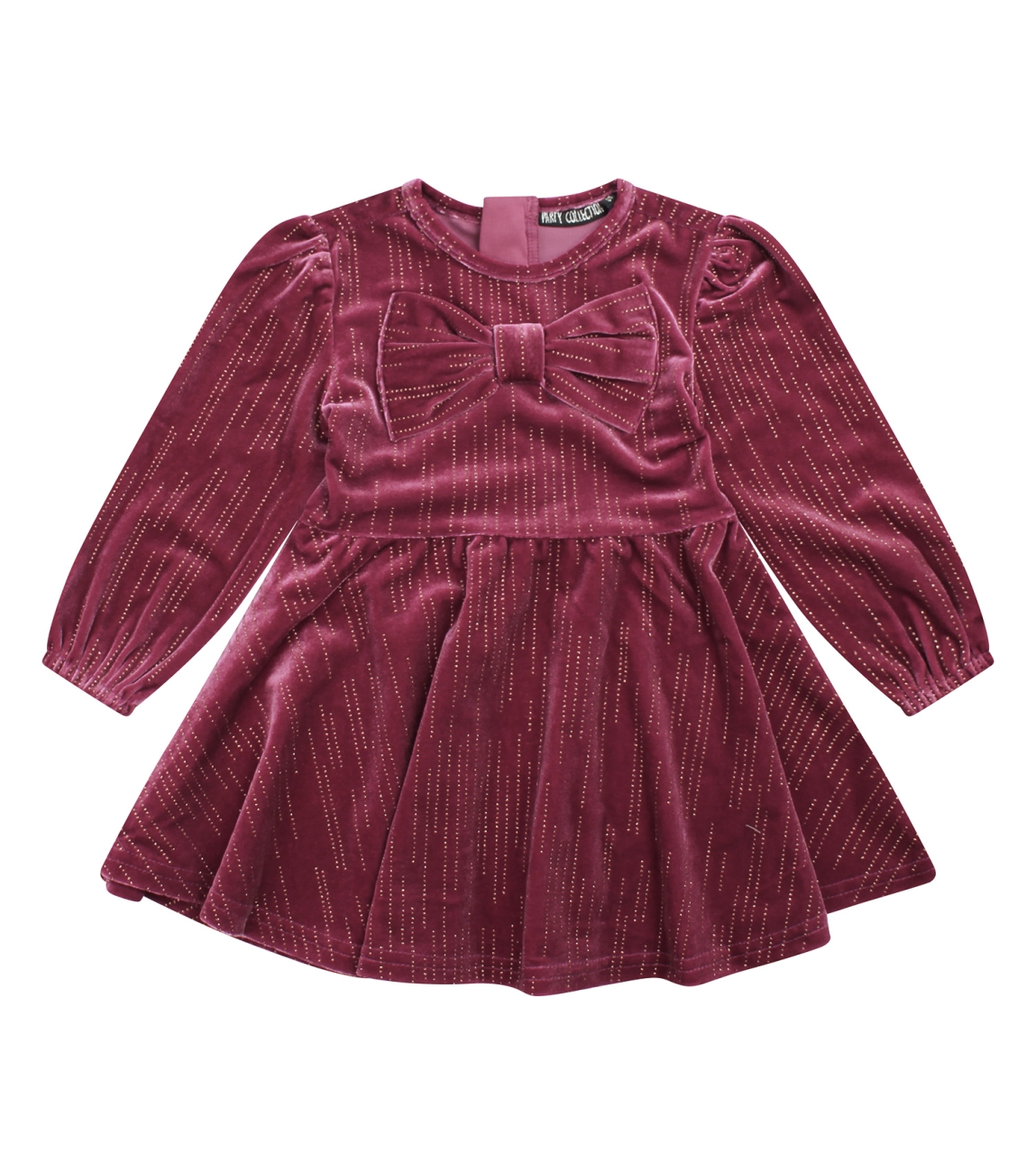Omschrijving | Pol/el velvet/glitter, strik, pofmouw |