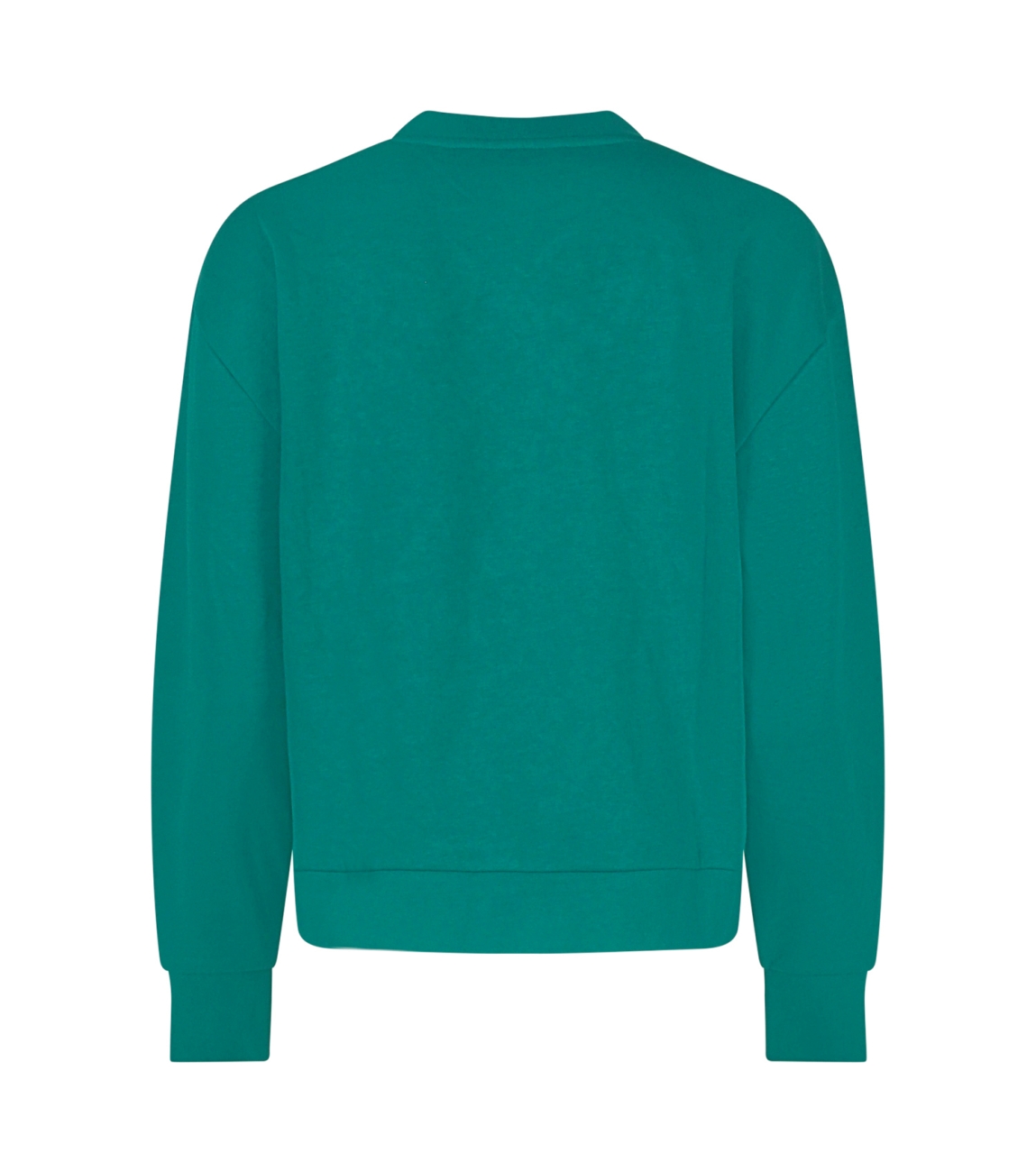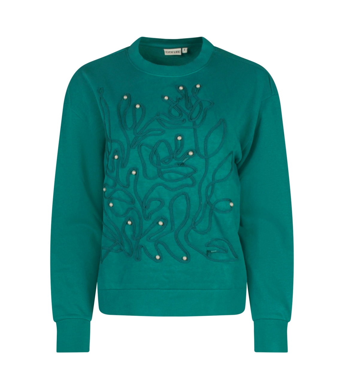 Omschrijving | Co/pol sweat, opgestikt lint, parelstuds |