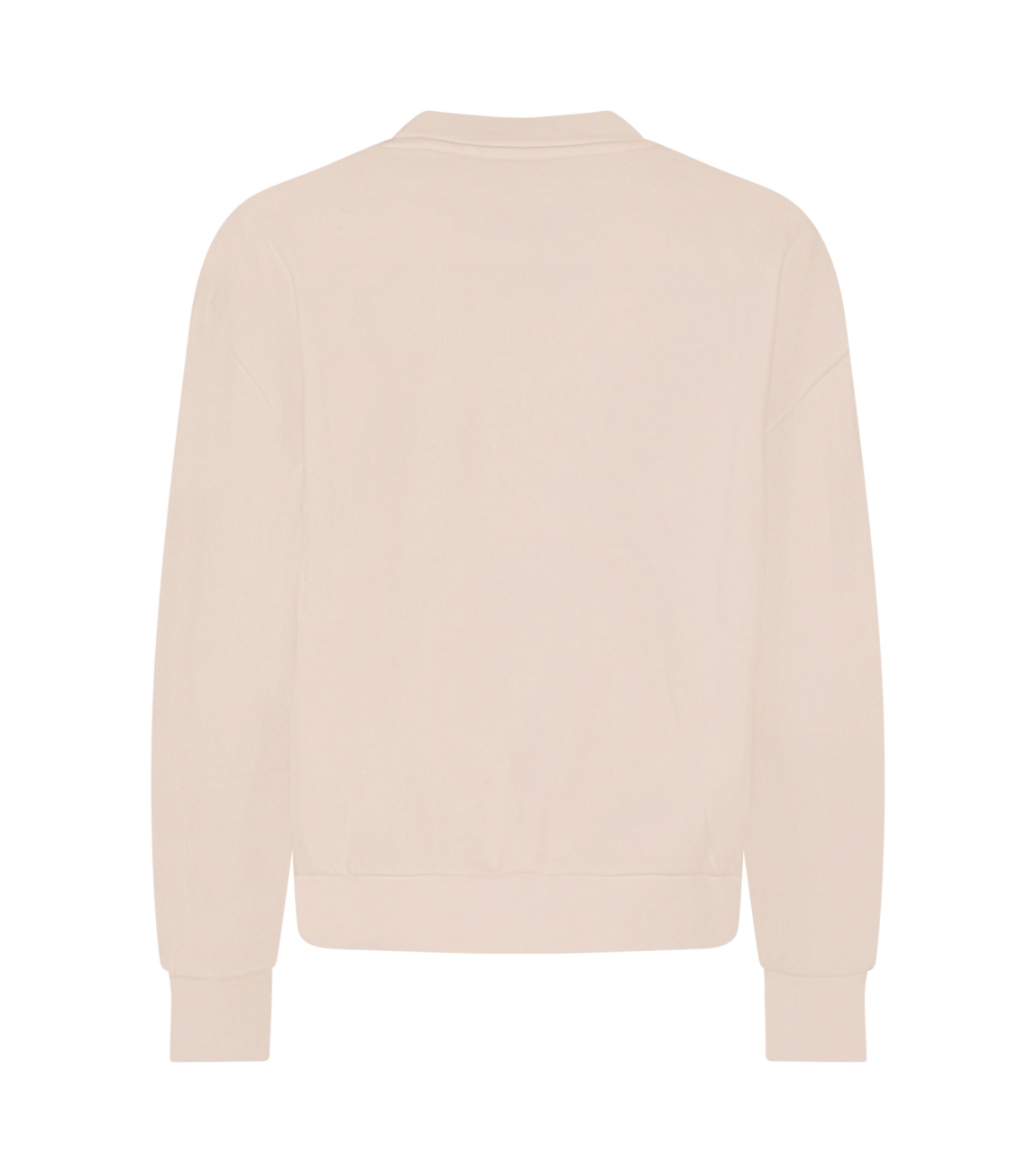 Omschrijving | Co/pol sweat, opgestikt lint, parelstuds |