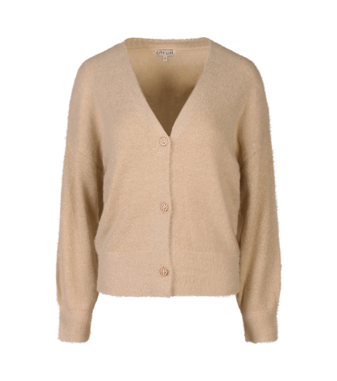 Omschrijving | Featheryarn/lurex, fancy knopen |