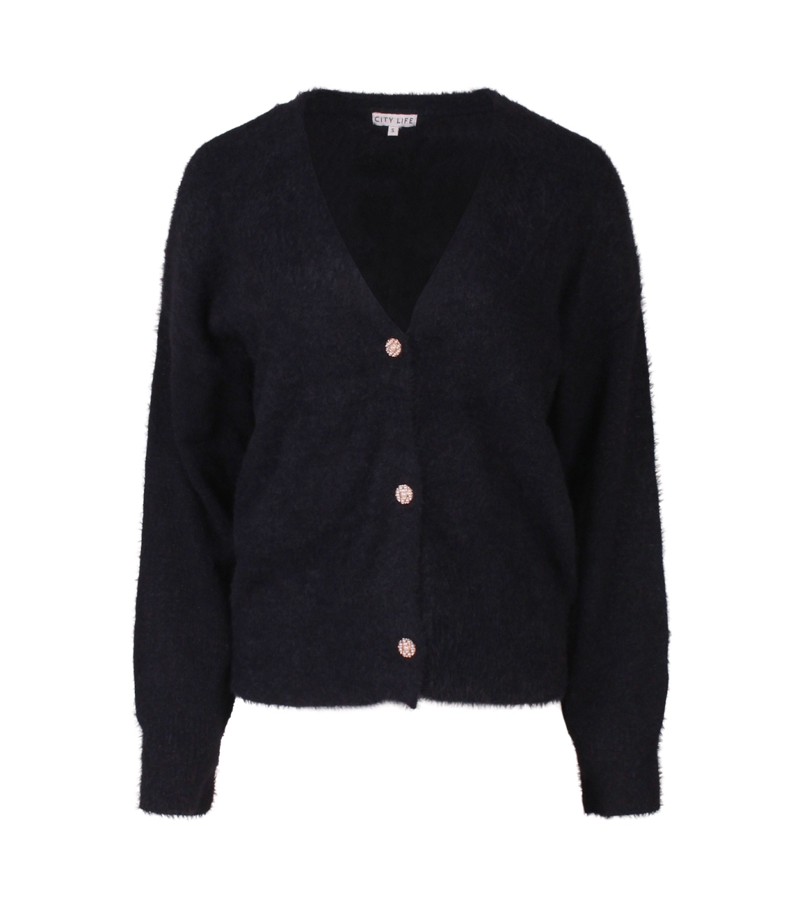Omschrijving | Featheryarn/lurex, fancy knopen |