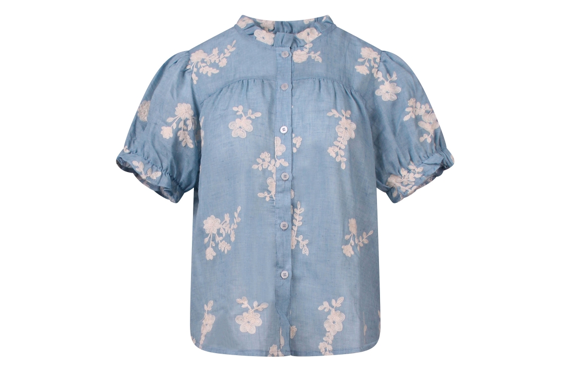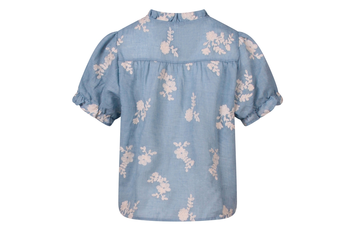 Omschrijving Co crepe, geborduurde bloem, pofmouw
