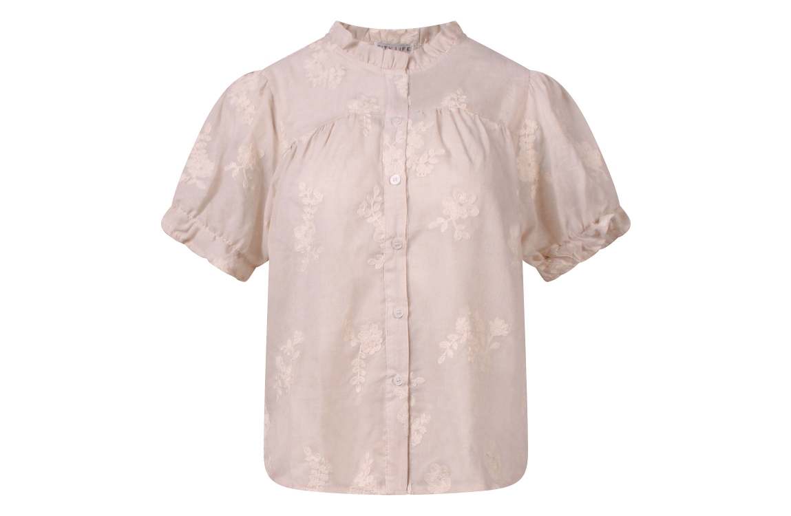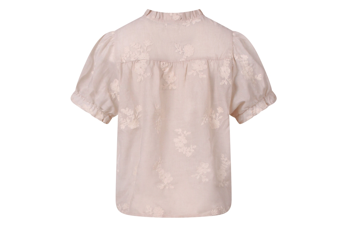 Omschrijving Co crepe, geborduurde bloem, pofmouw