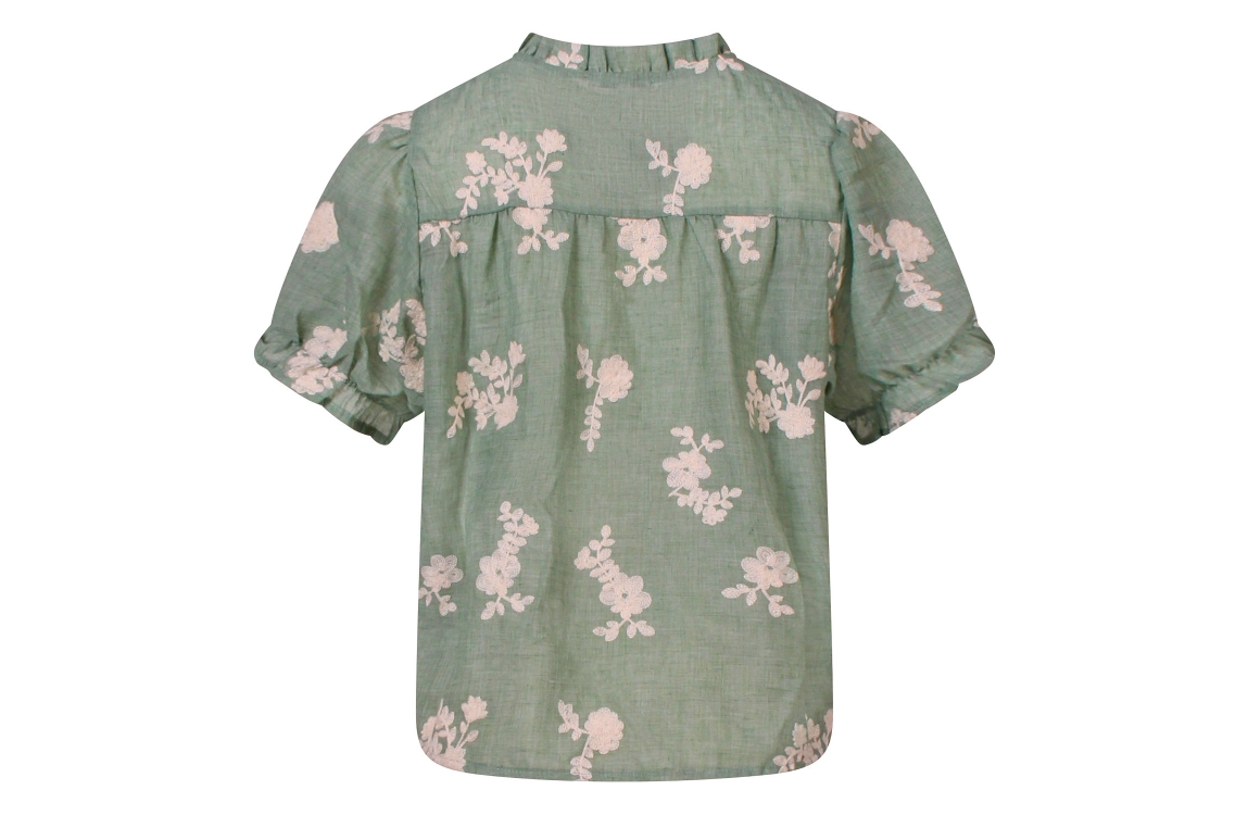Omschrijving Co crepe, geborduurde bloem, pofmouw