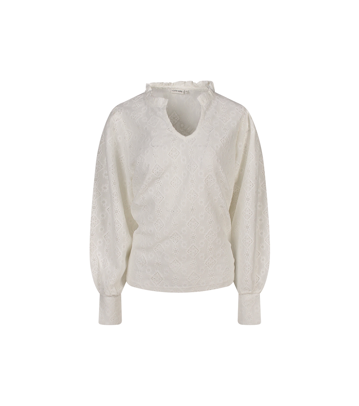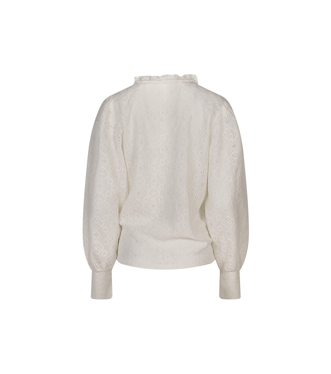 Omschrijving | Pol/el ajour, pofmouw, ruche hals |