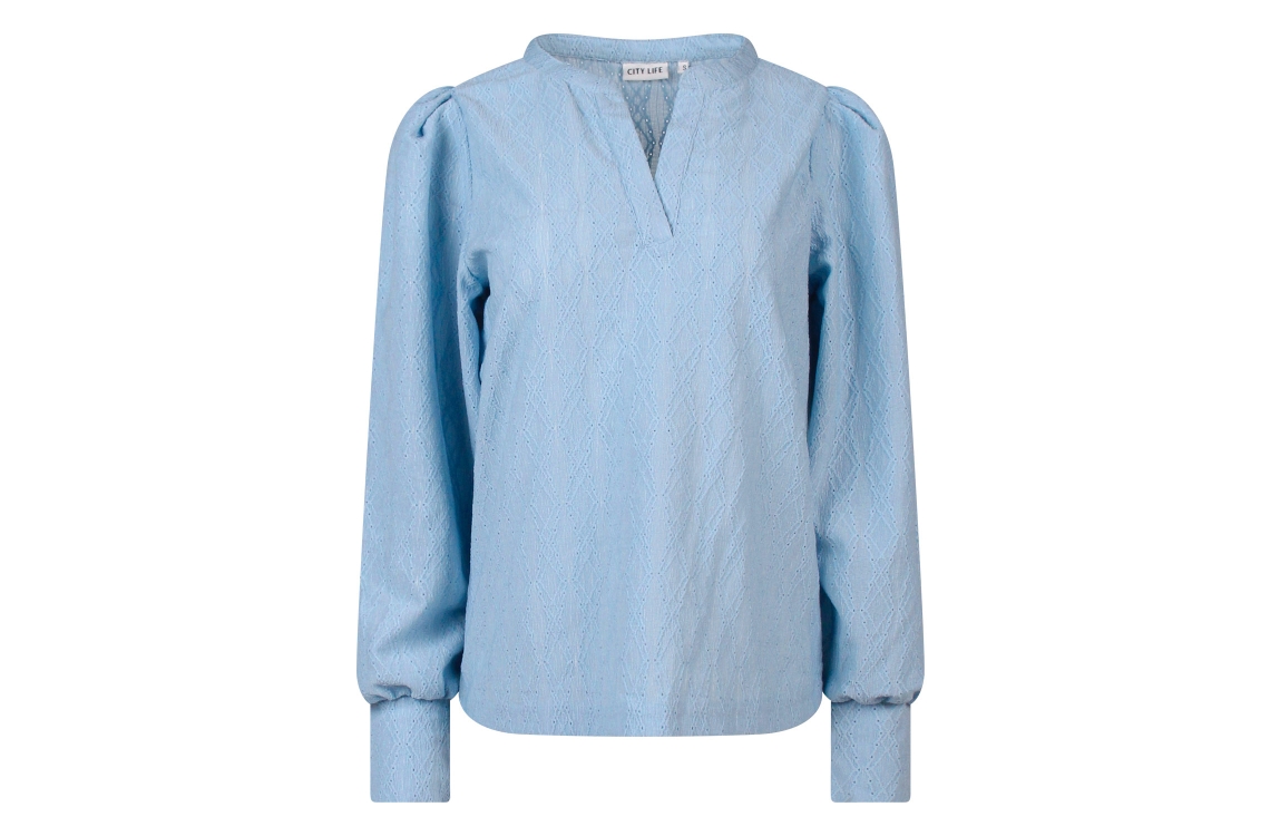 Omschrijving Pol/el ajour, pofmouw, v-hals
