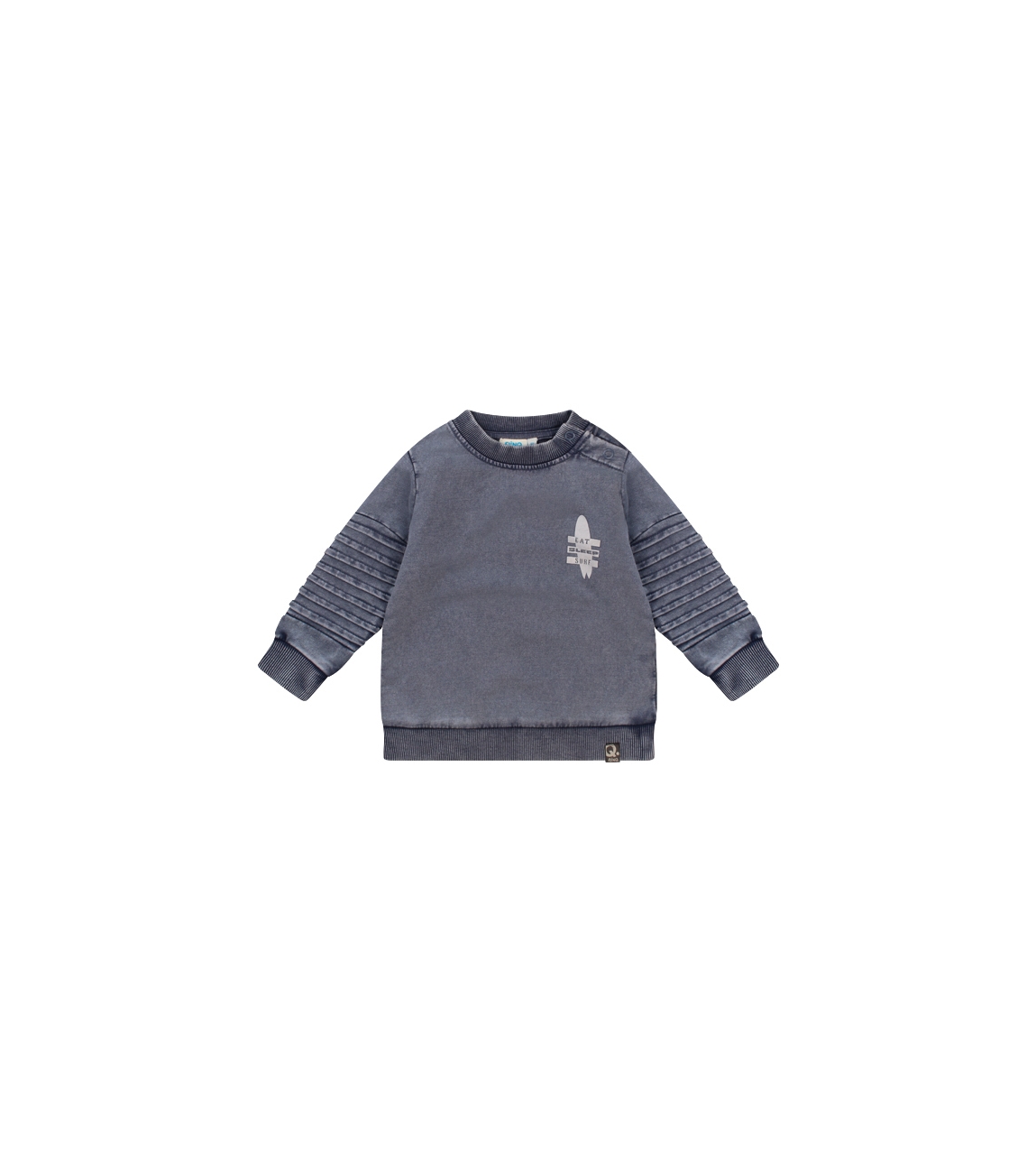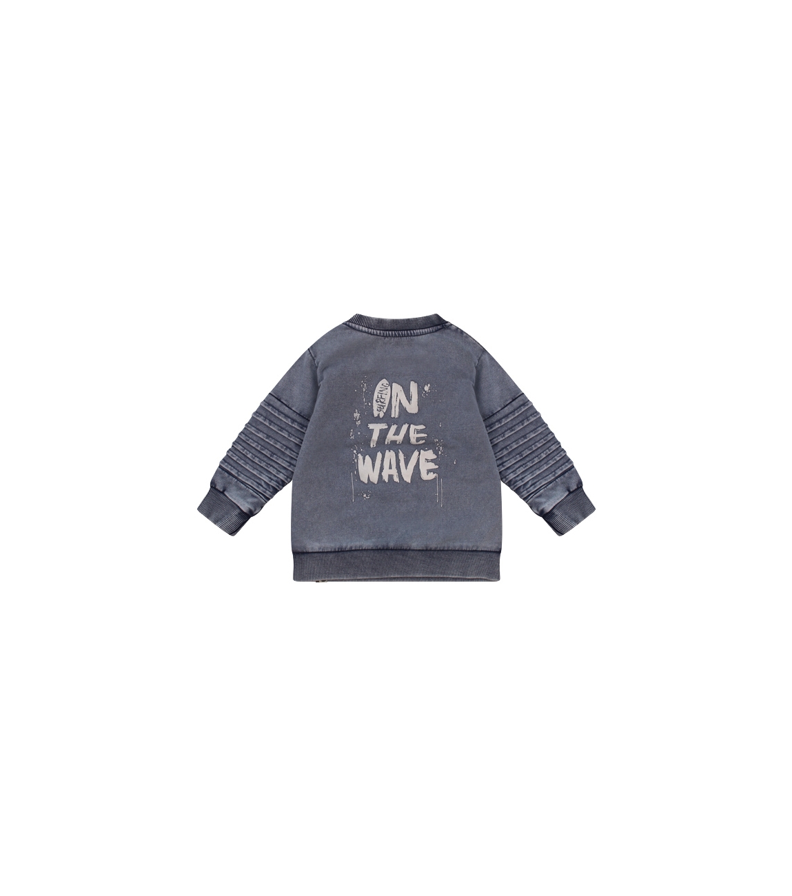 Omschrijving | Co/ly sweat, acid wash, rugprint, opnaadjes |