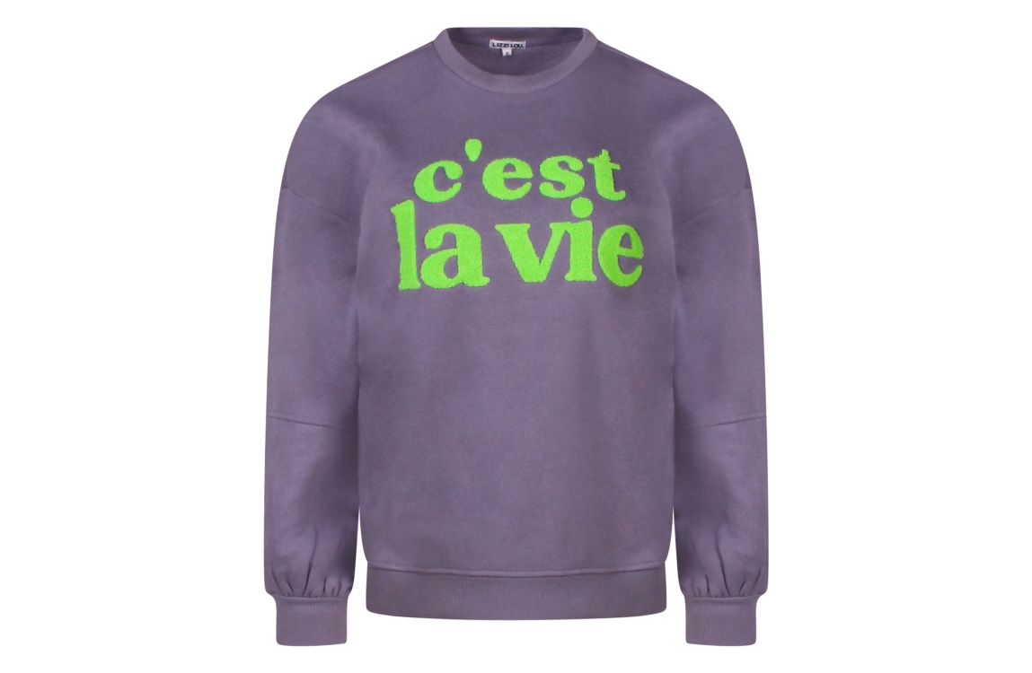 Omschrijving Co/pol sweat, frotte tekstapplieks, pofmouw