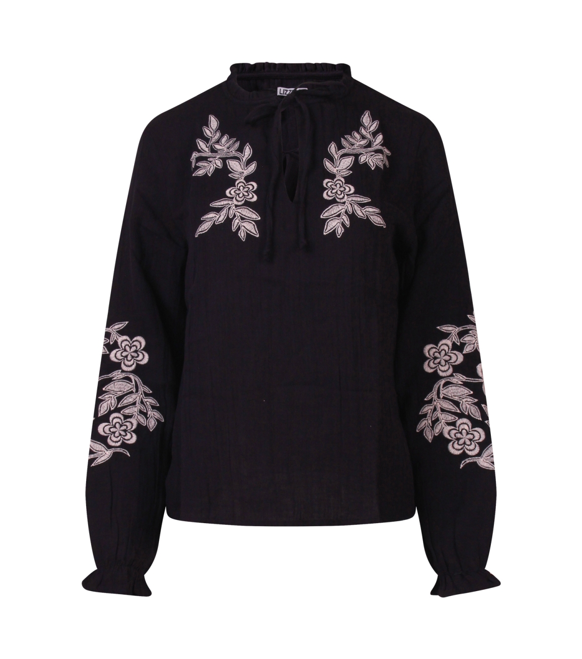 Omschrijving | Mousseline, borduur chest/mouwen |