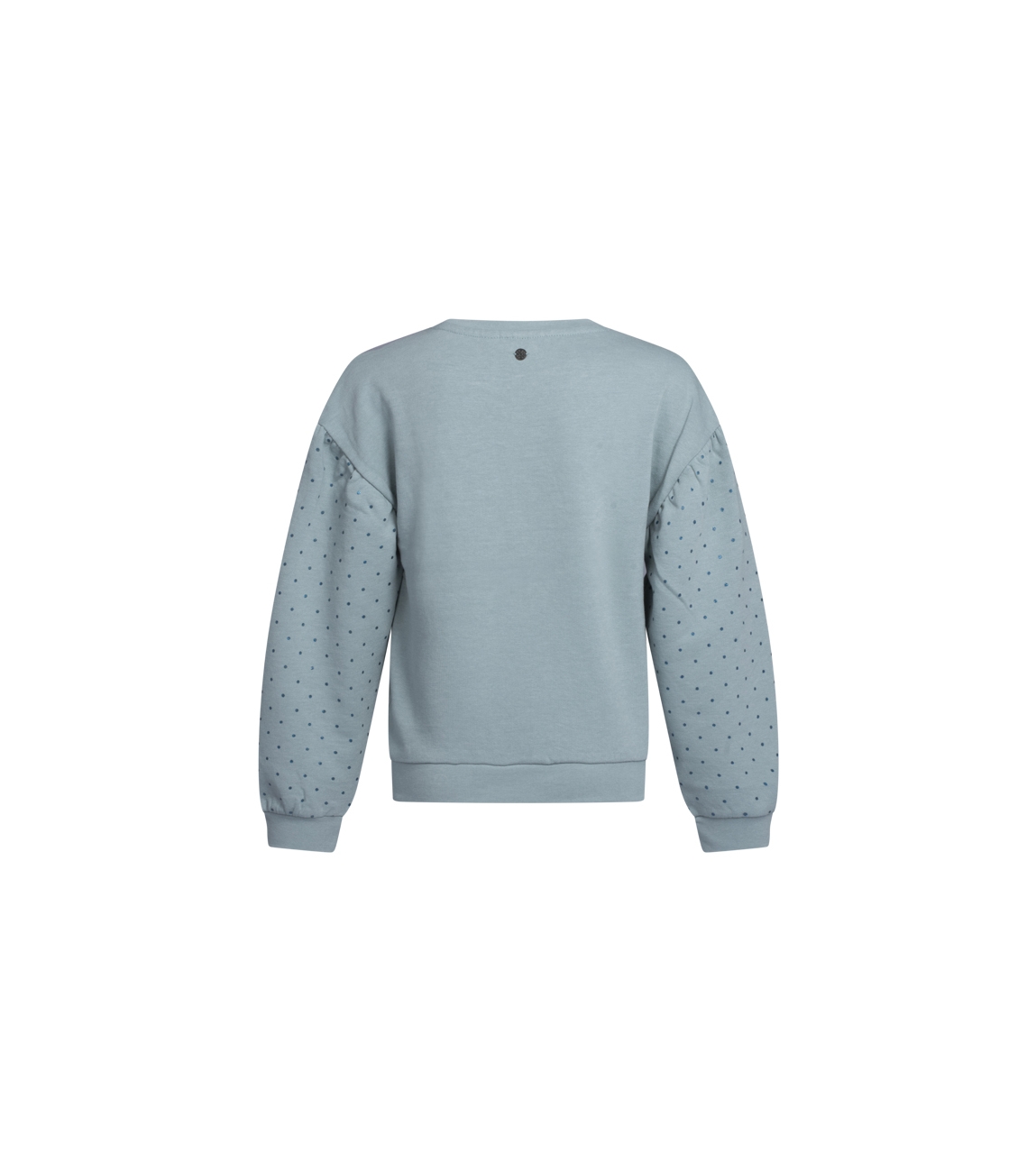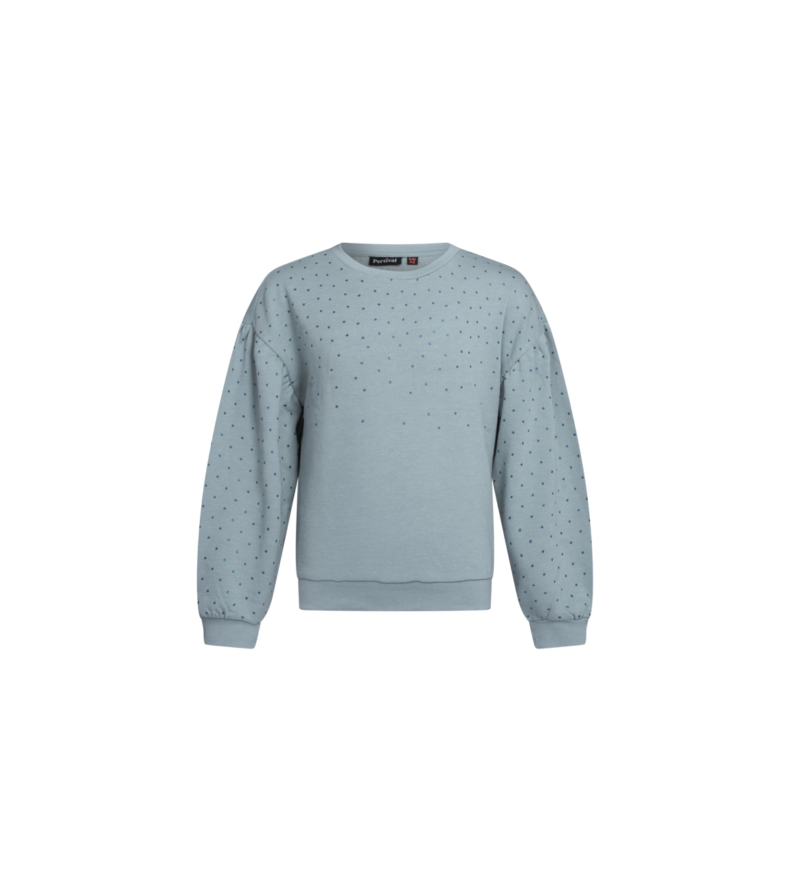 Omschrijving | Co/pol sweat, glitterstip, pofmouw |