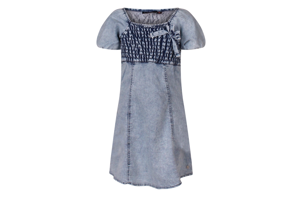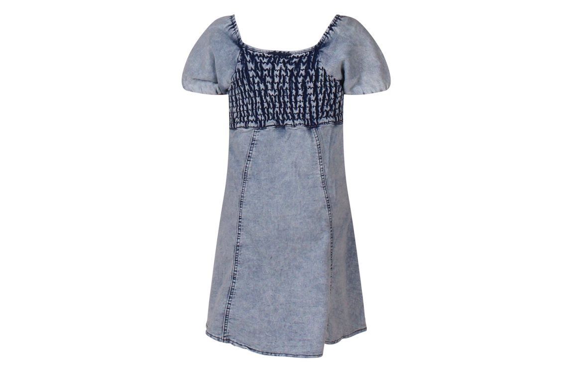 Omschrijving Sweatdenim, smock, pofmouw, A-lijn