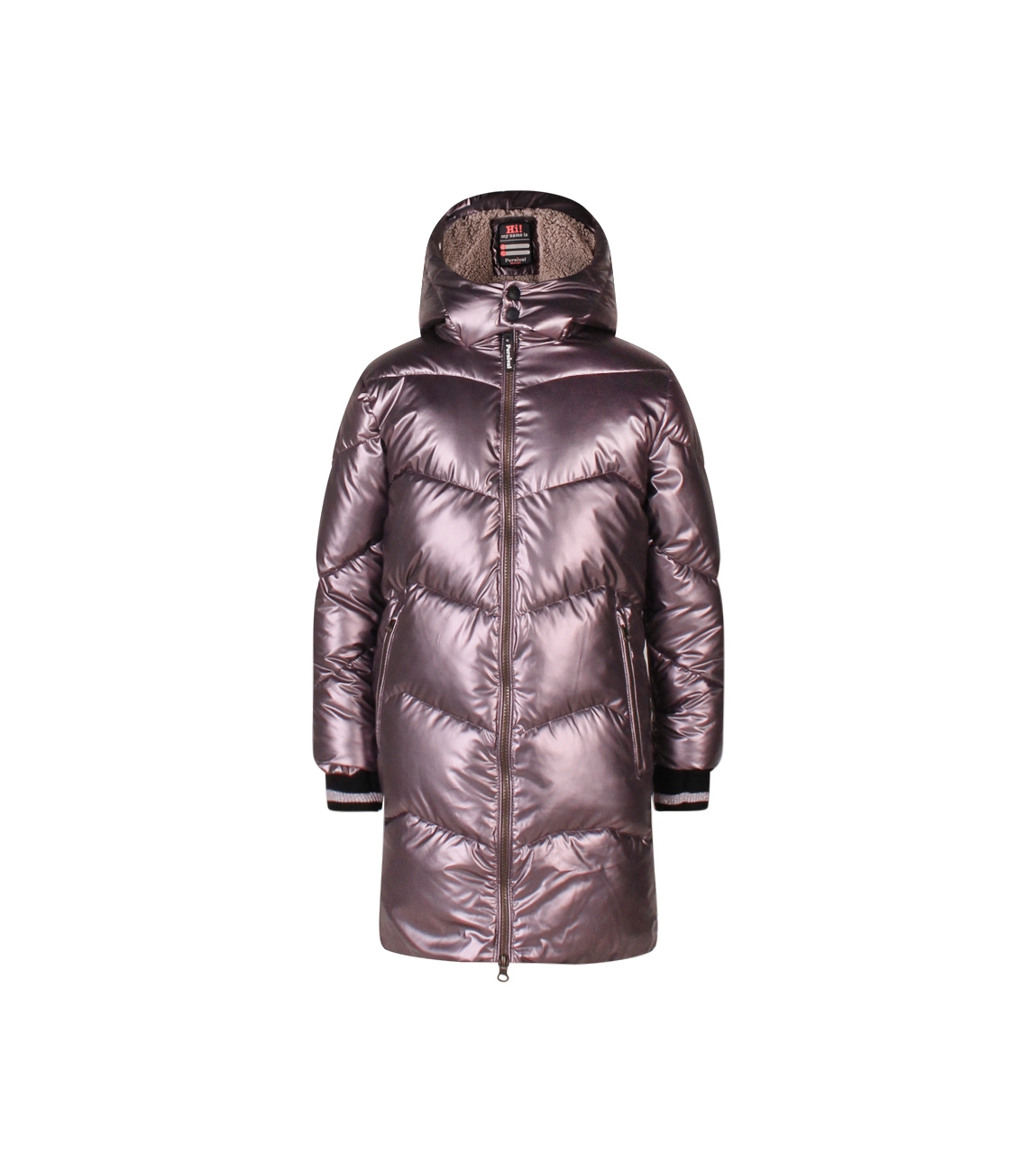 Omschrijving | Pol. metalic, hood teddy, ritszakken |