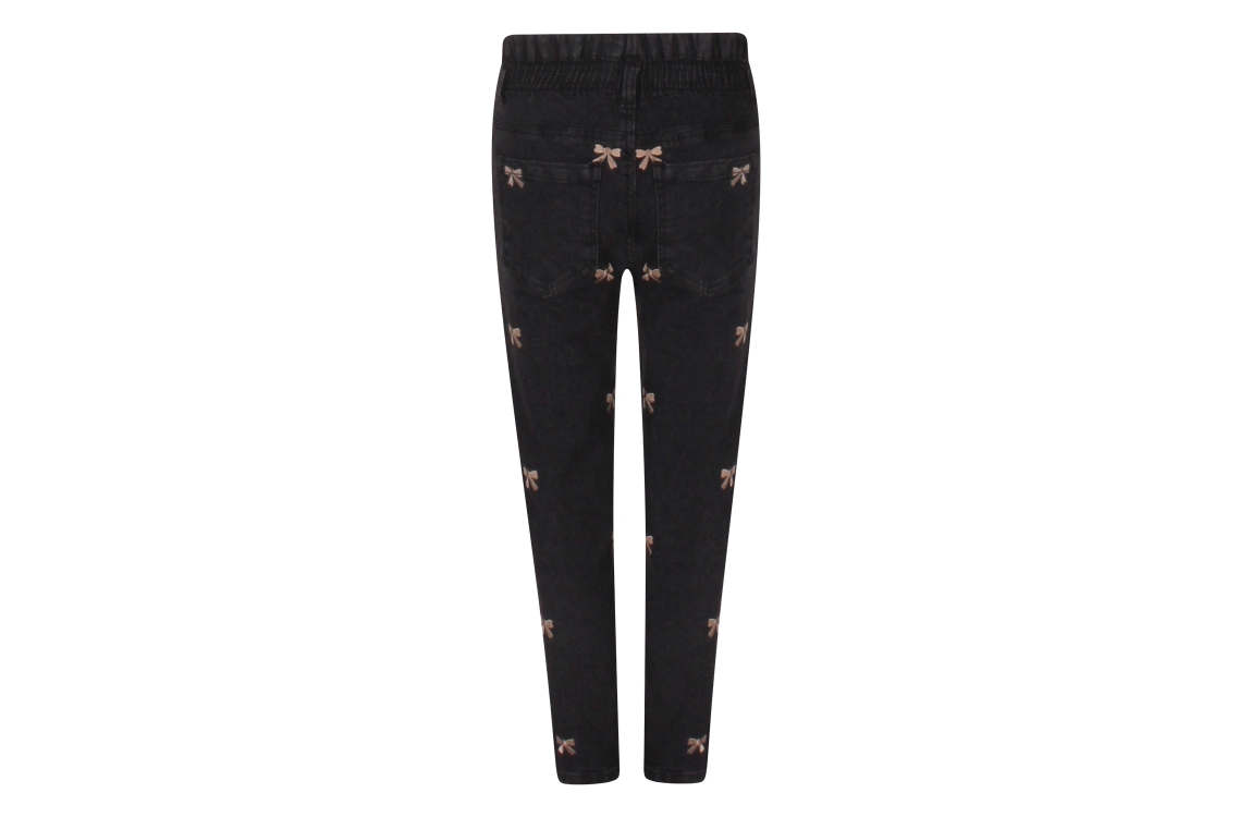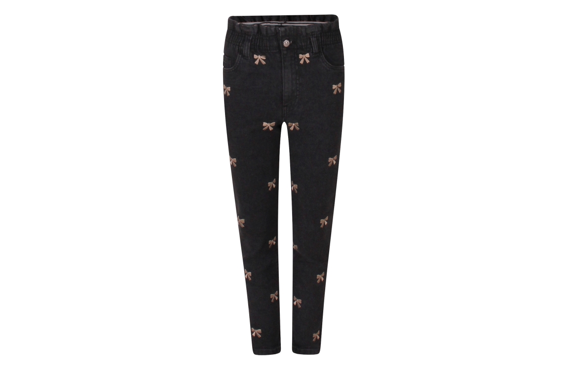 Omschrijving Co/el denim, geborduurde strikjes, tapered