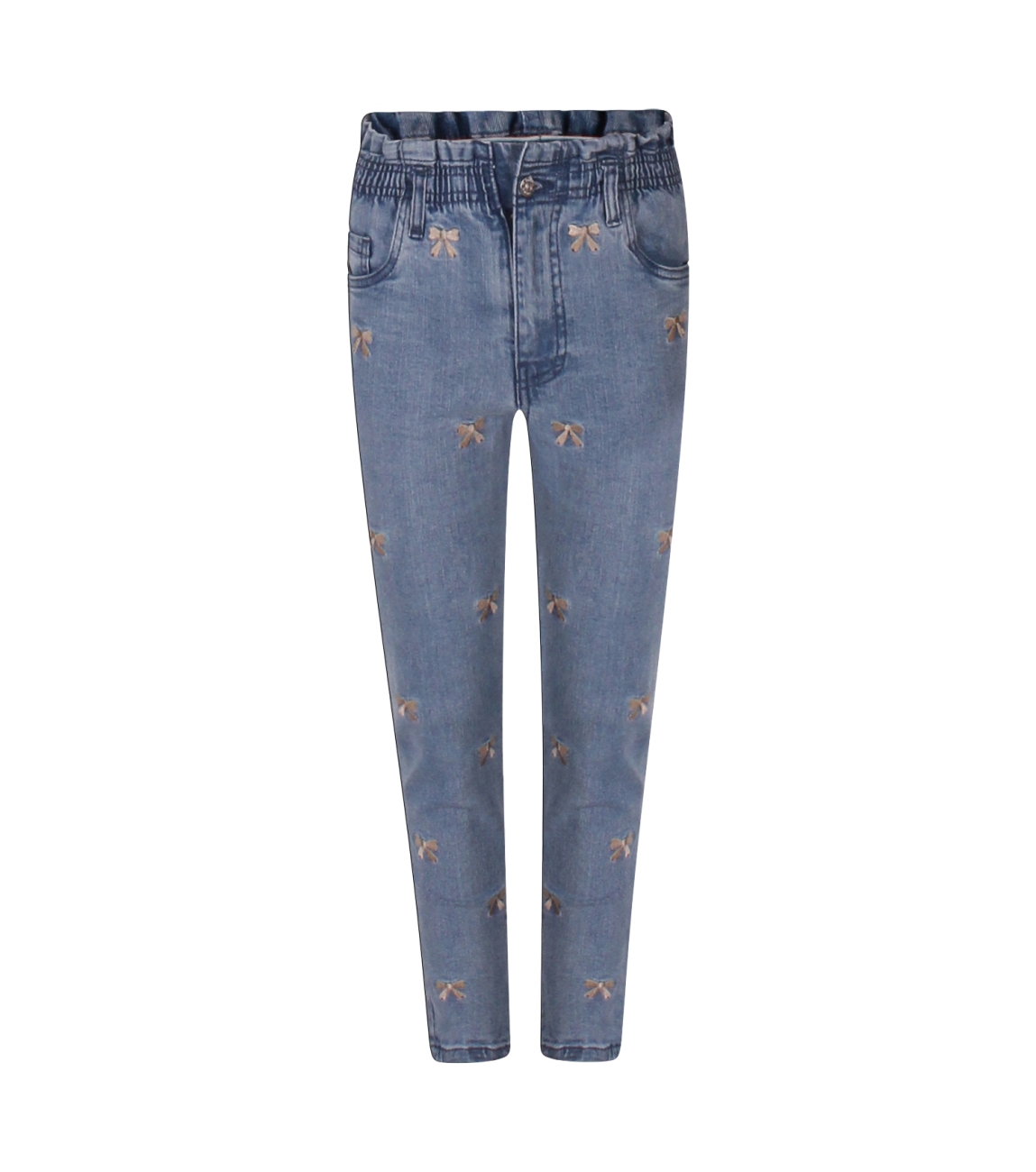 Omschrijving | Co/el denim, geborduurde strikjes, tapered |