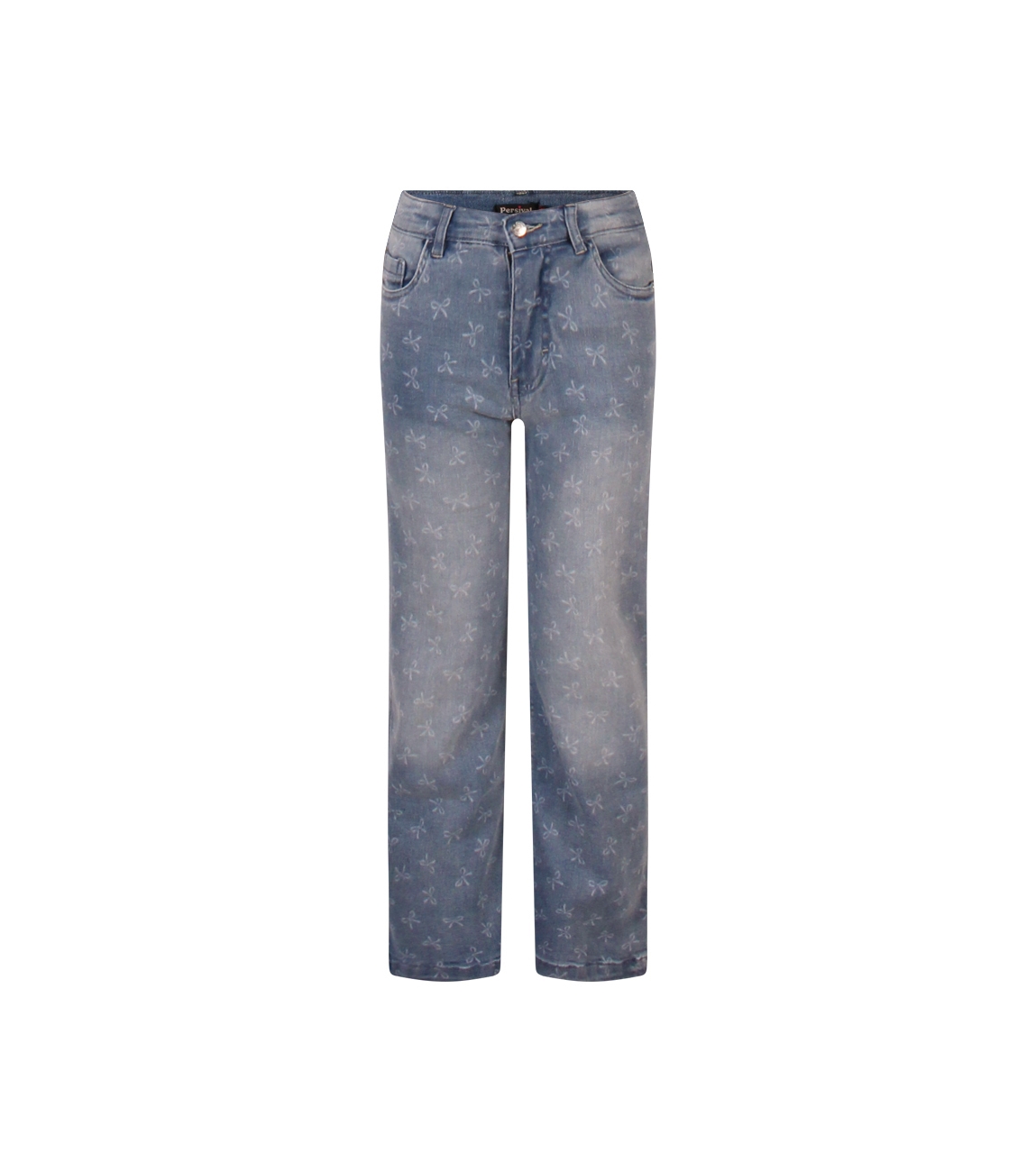 Omschrijving | Co/el denim, gebleekte strikjes, rechte pijp |