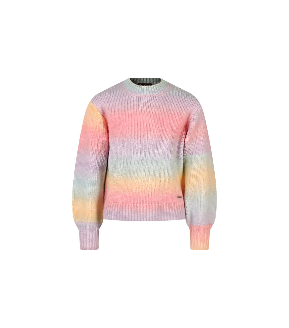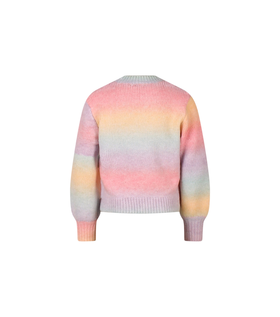 Omschrijving | Ribbrei, regenboogkleuren, turtleneck |