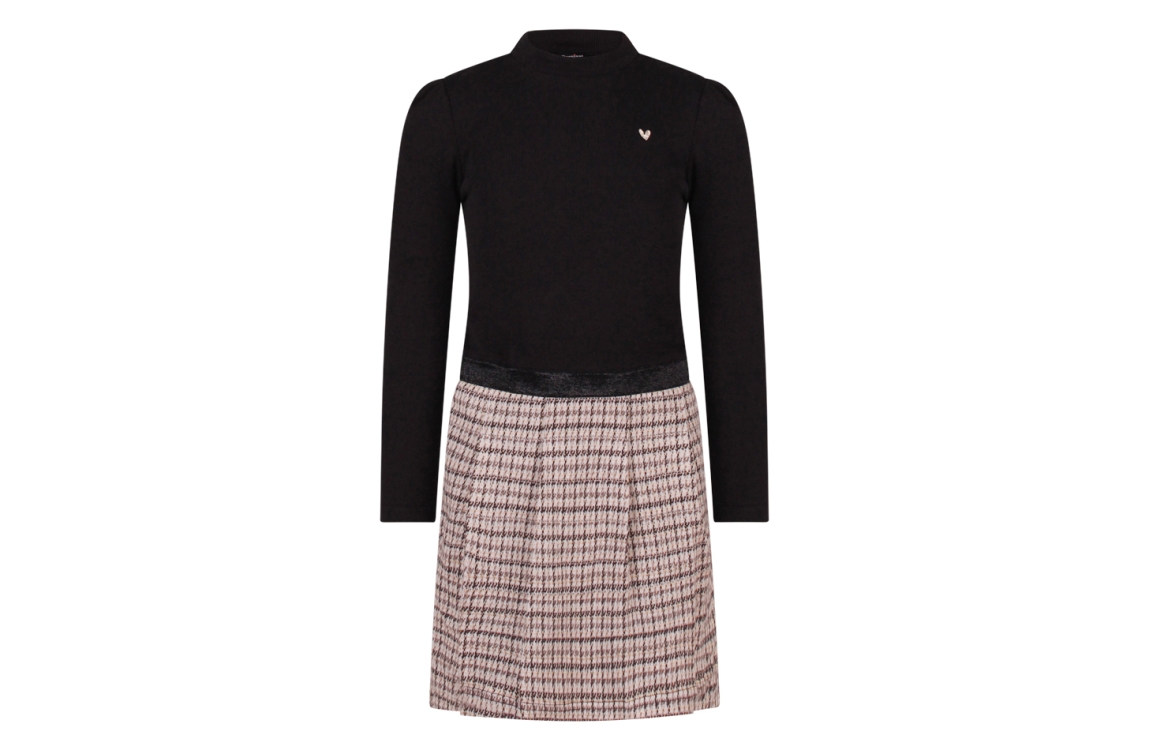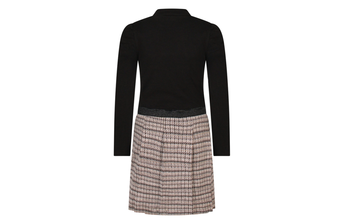Omschrijving Ribtop turtleneck, geruite plooirok lurex