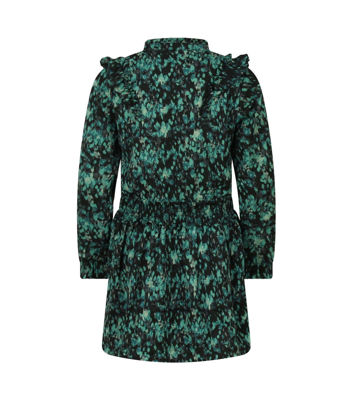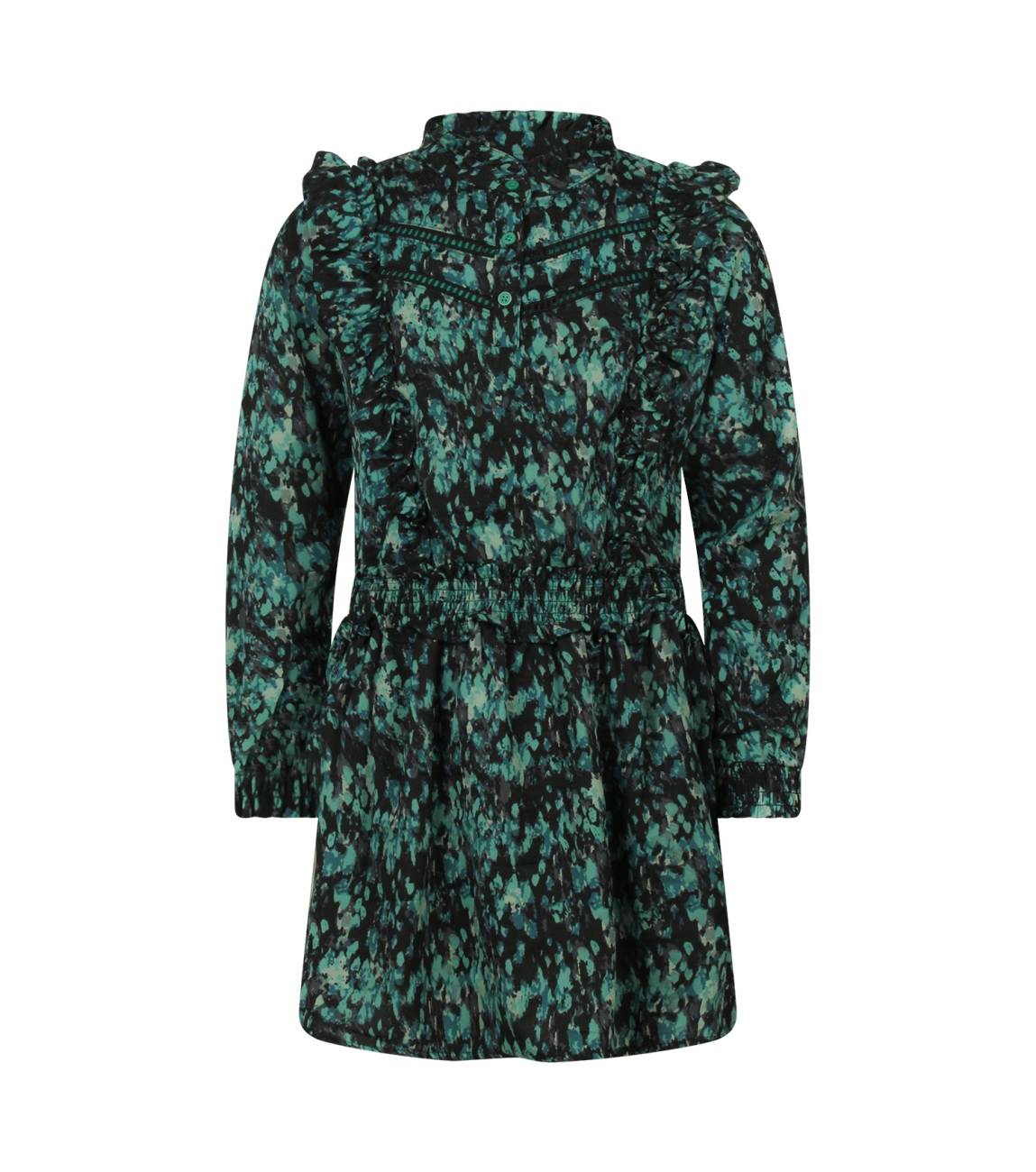 Omschrijving | Pol. crepe, confettidessin, ruches/smock |