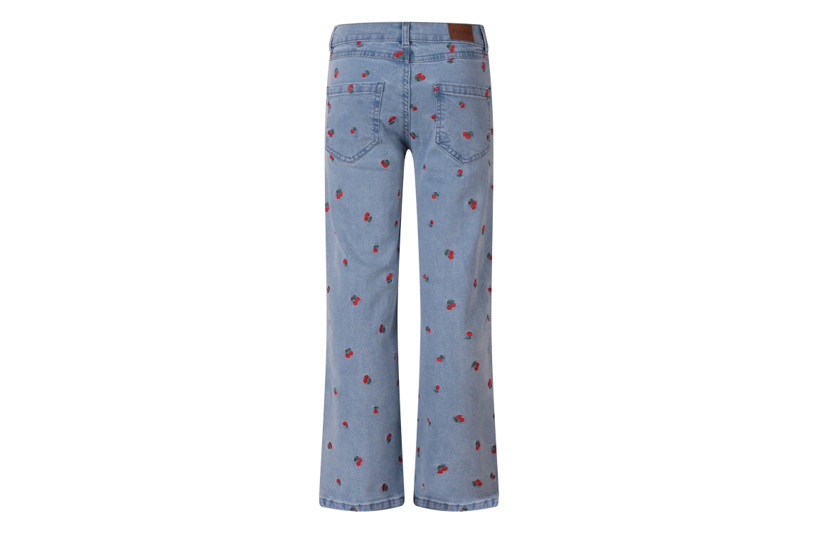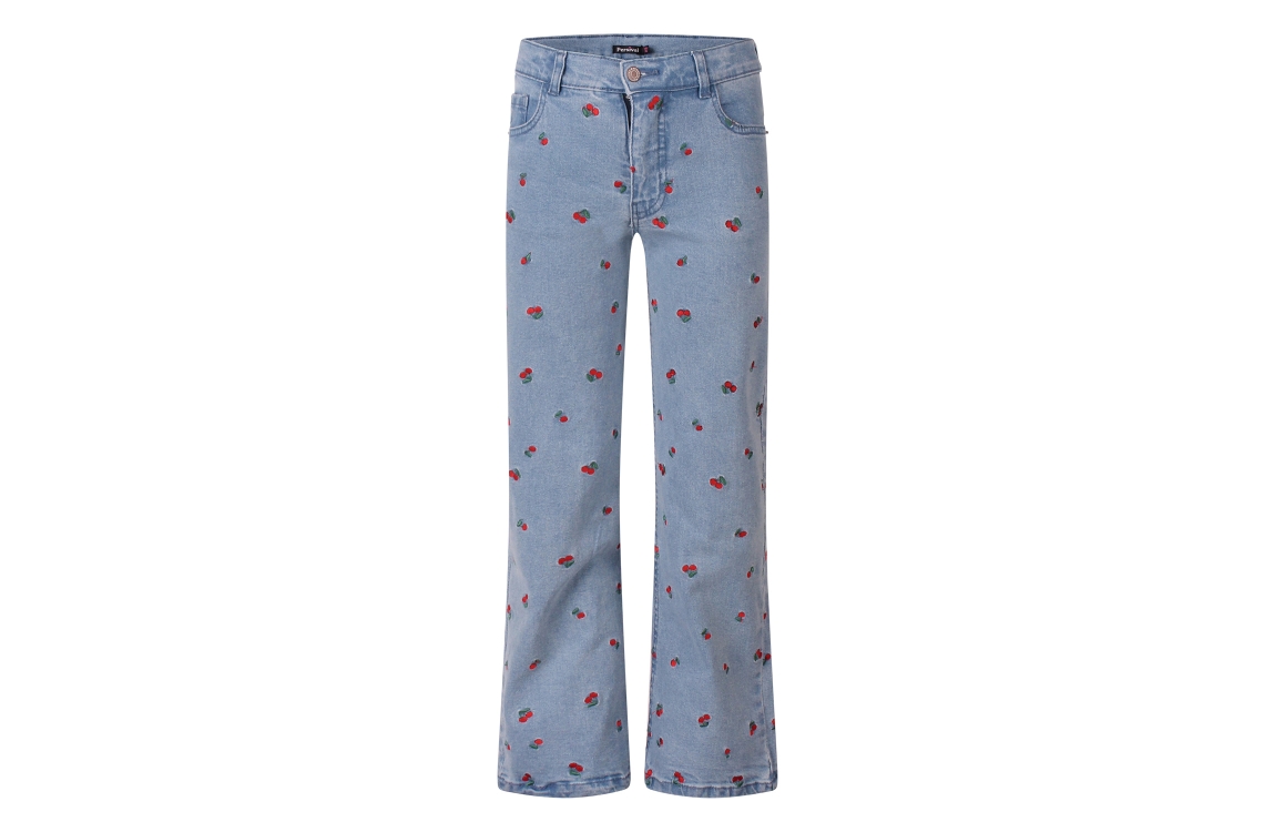 Omschrijving Co/el denim, kersenborduur, wijde pijp