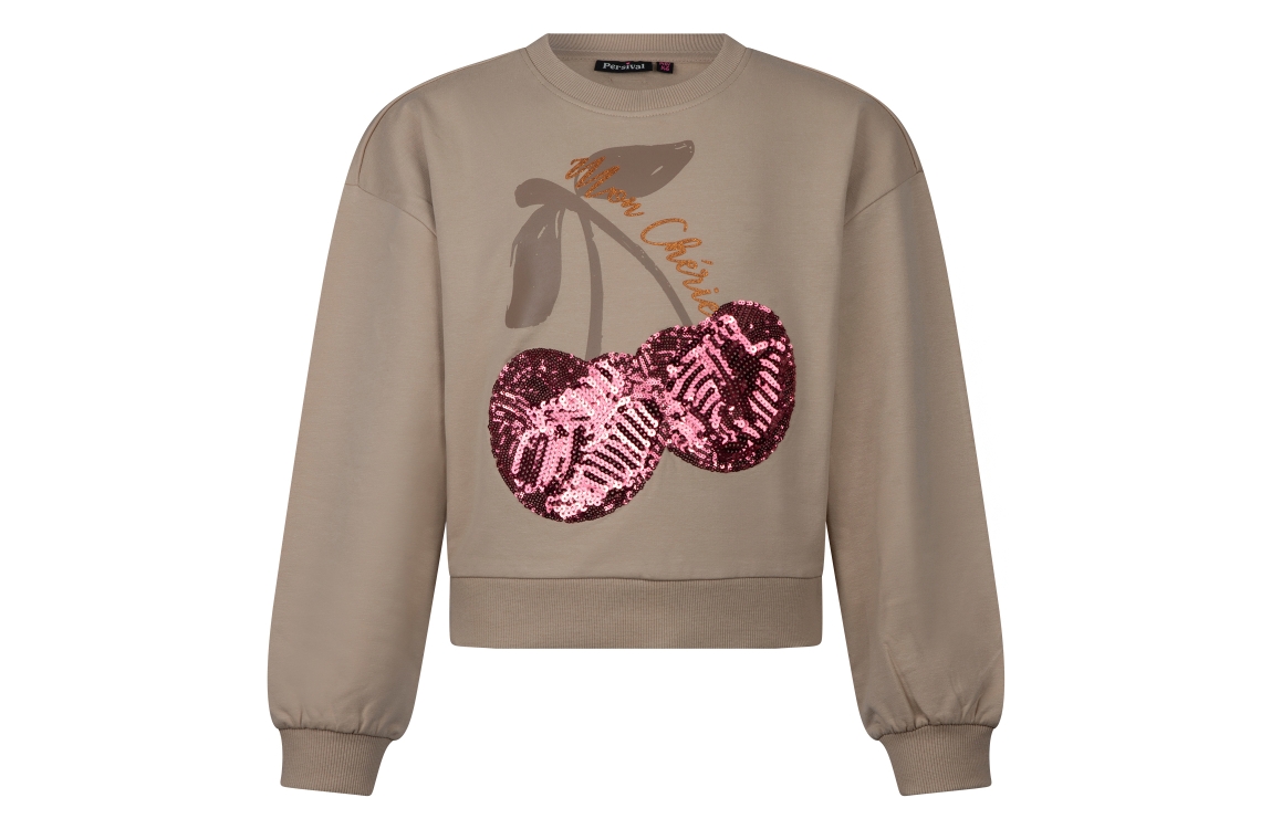 Omschrijving Co/ly sweat, kersenprint/pailetten, boxy fit