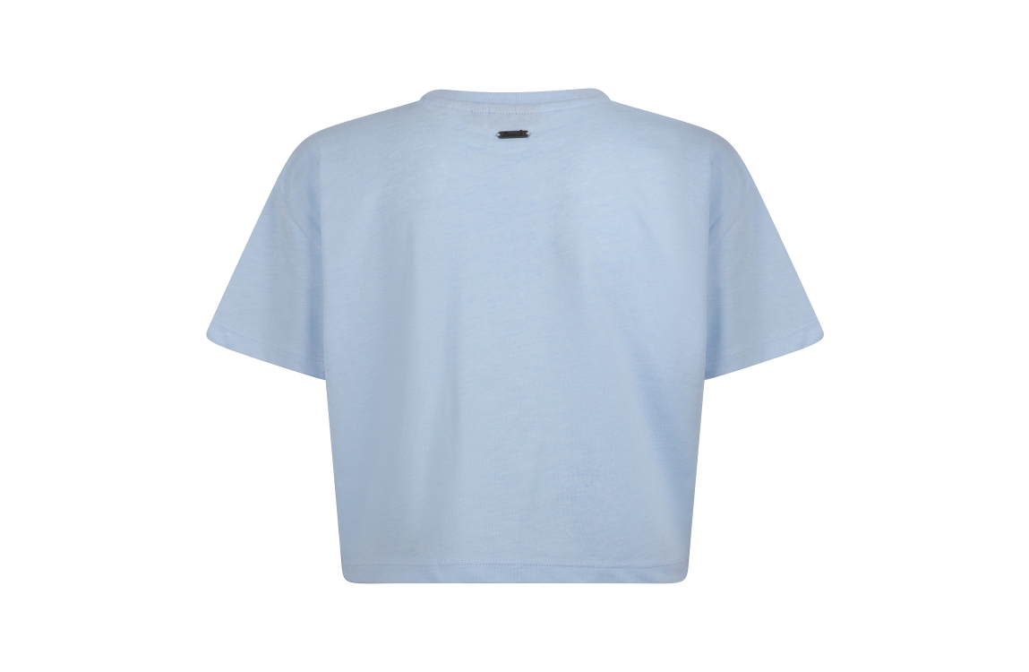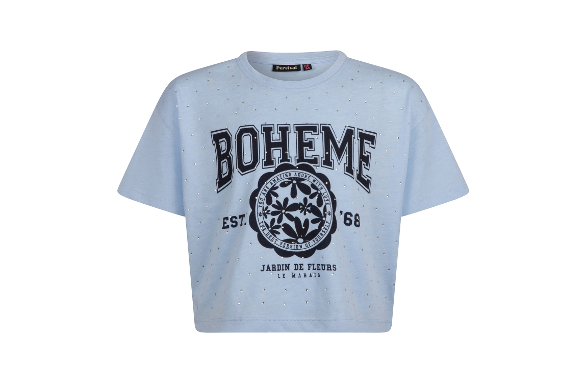 Omschrijving Co/pol, varsity print, strass, boxy fit