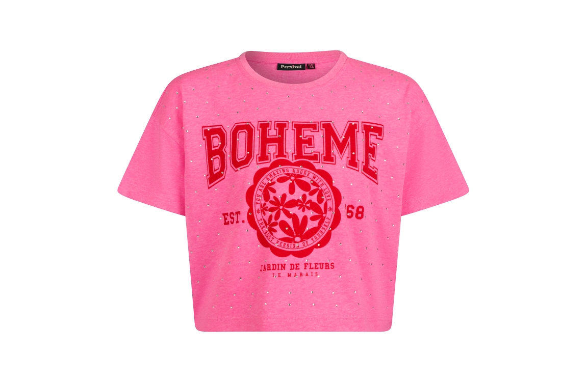 Omschrijving Co/pol, varsity print, strass, boxy fit