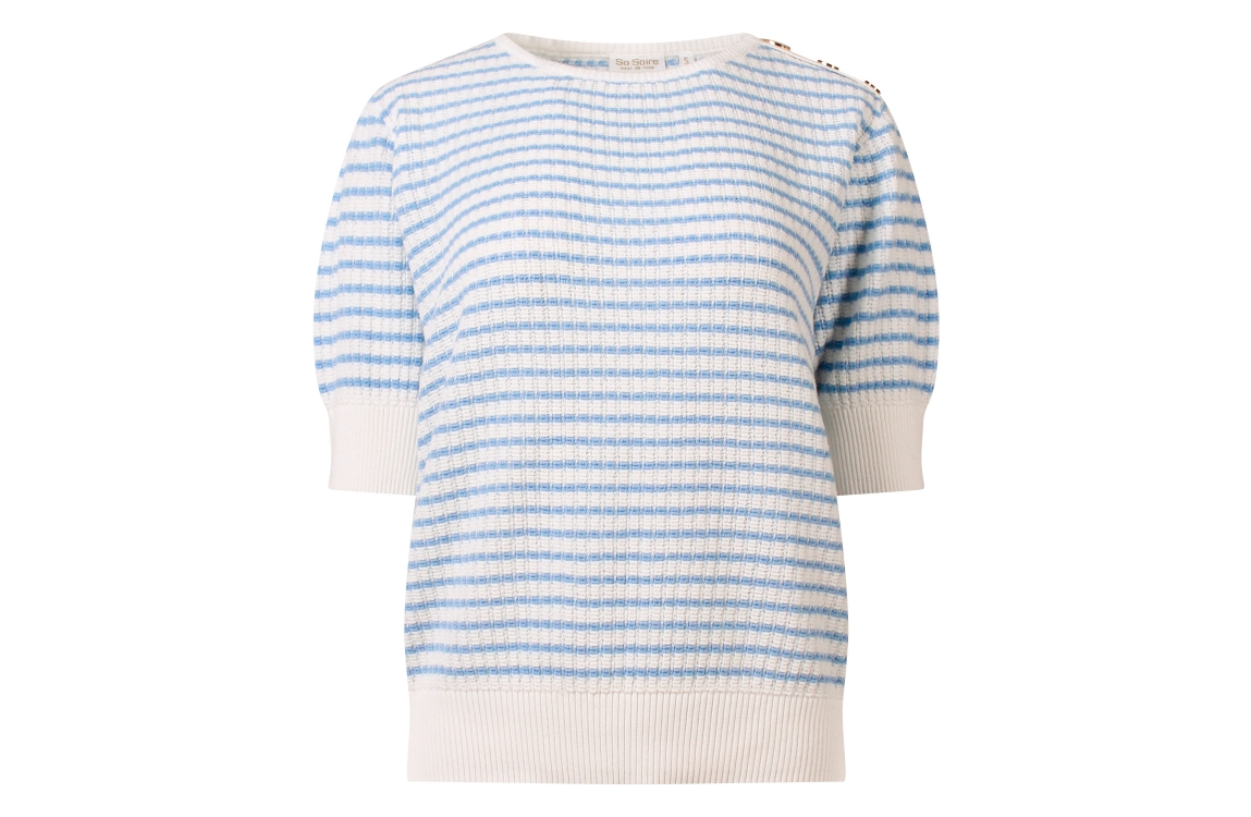 Omschrijving Fancy brei, streep, knopen schouder, korte mouw