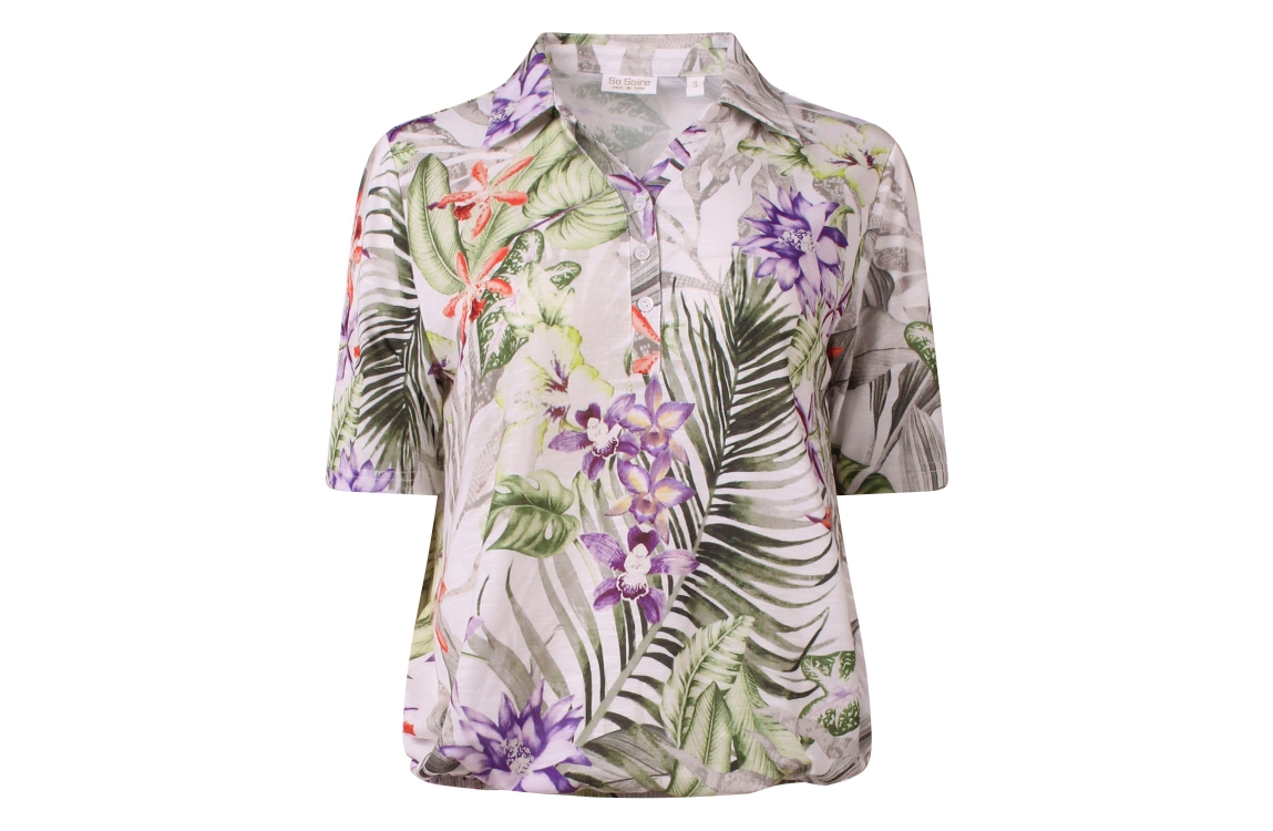 Omschrijving Pol/el slub, tropisch dessin, elastiek body