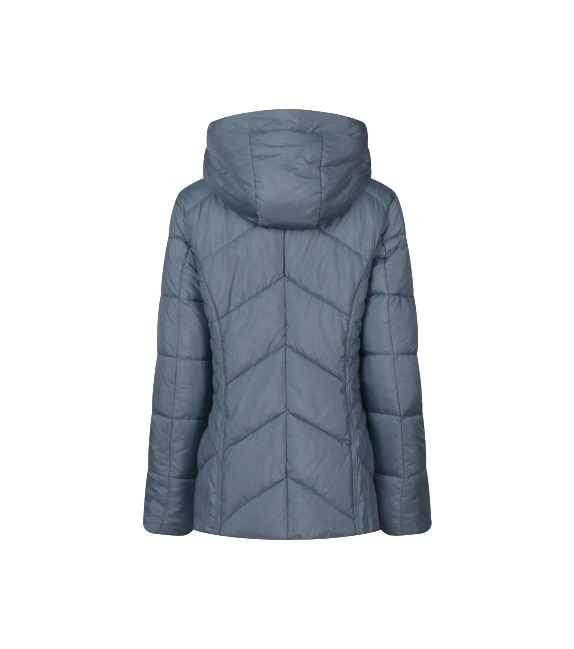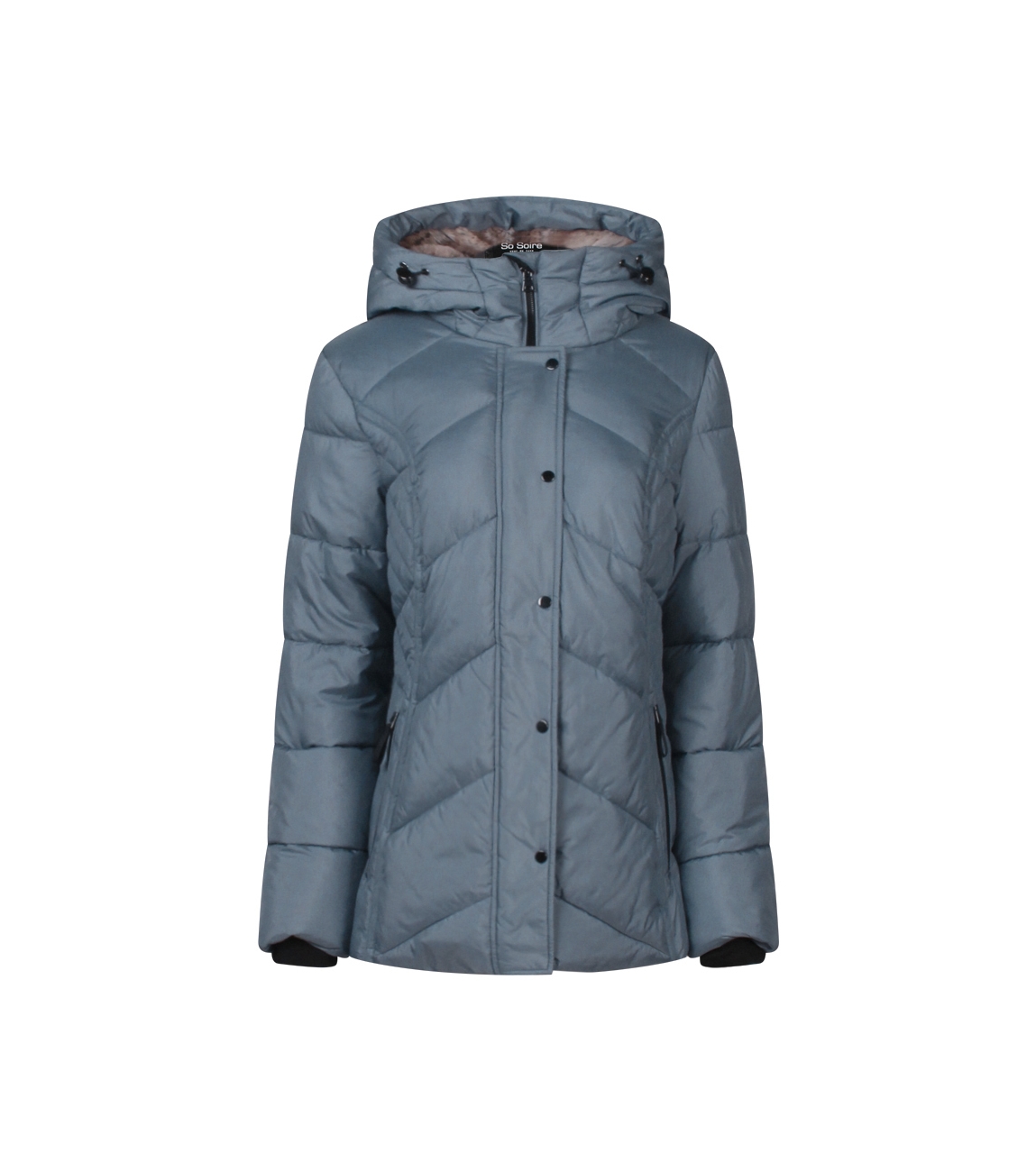 Omschrijving | Pol. gestept, hood bont, ritszakken |