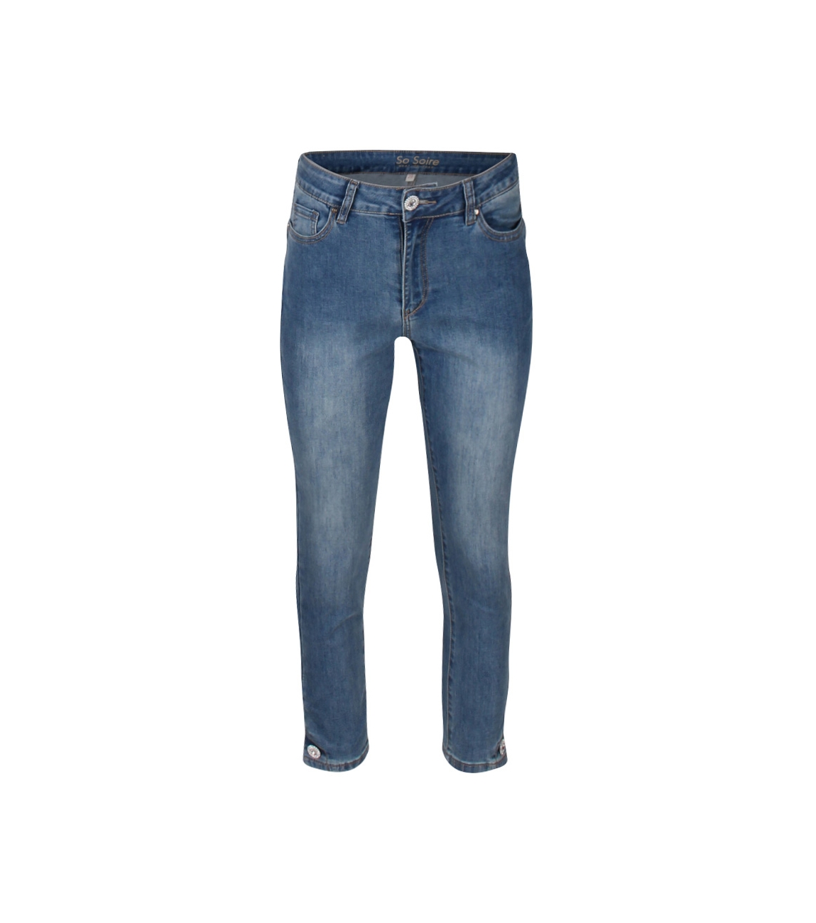 Omschrijving | Denim, 5-pocket, strassknopen, 26 inch |