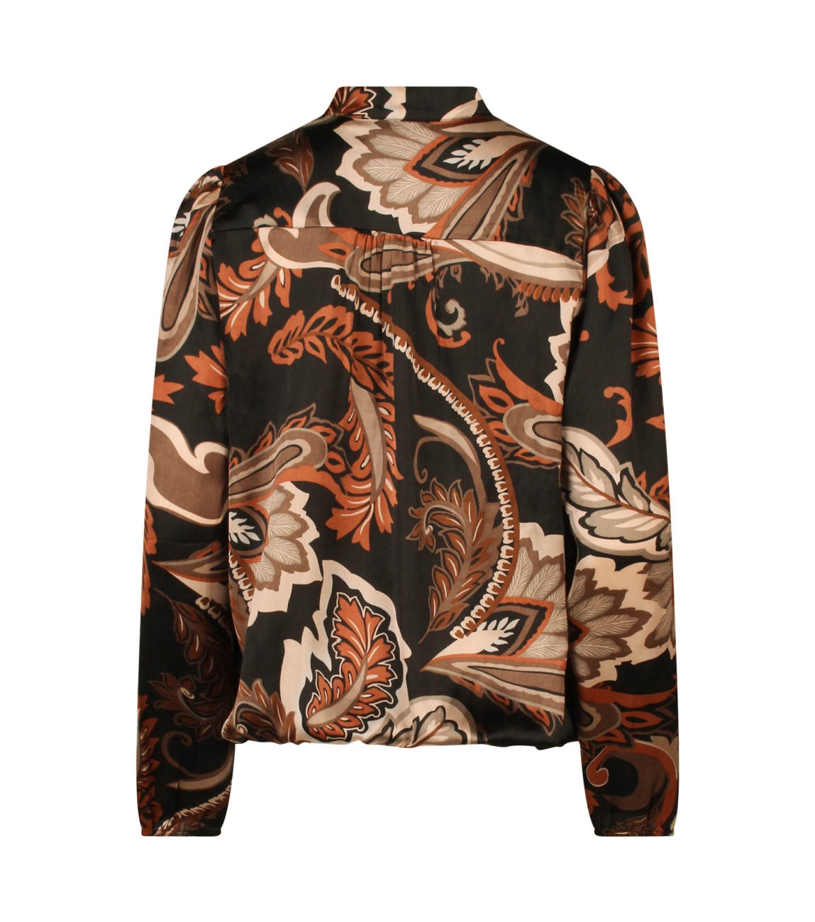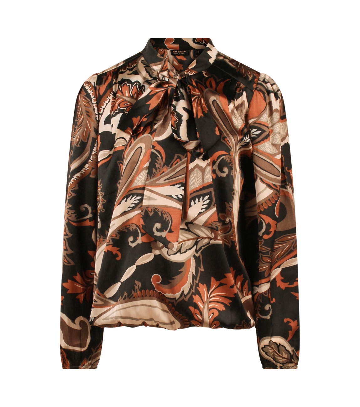 Omschrijving | Pol. satin, bloemdessin, strikkraag |