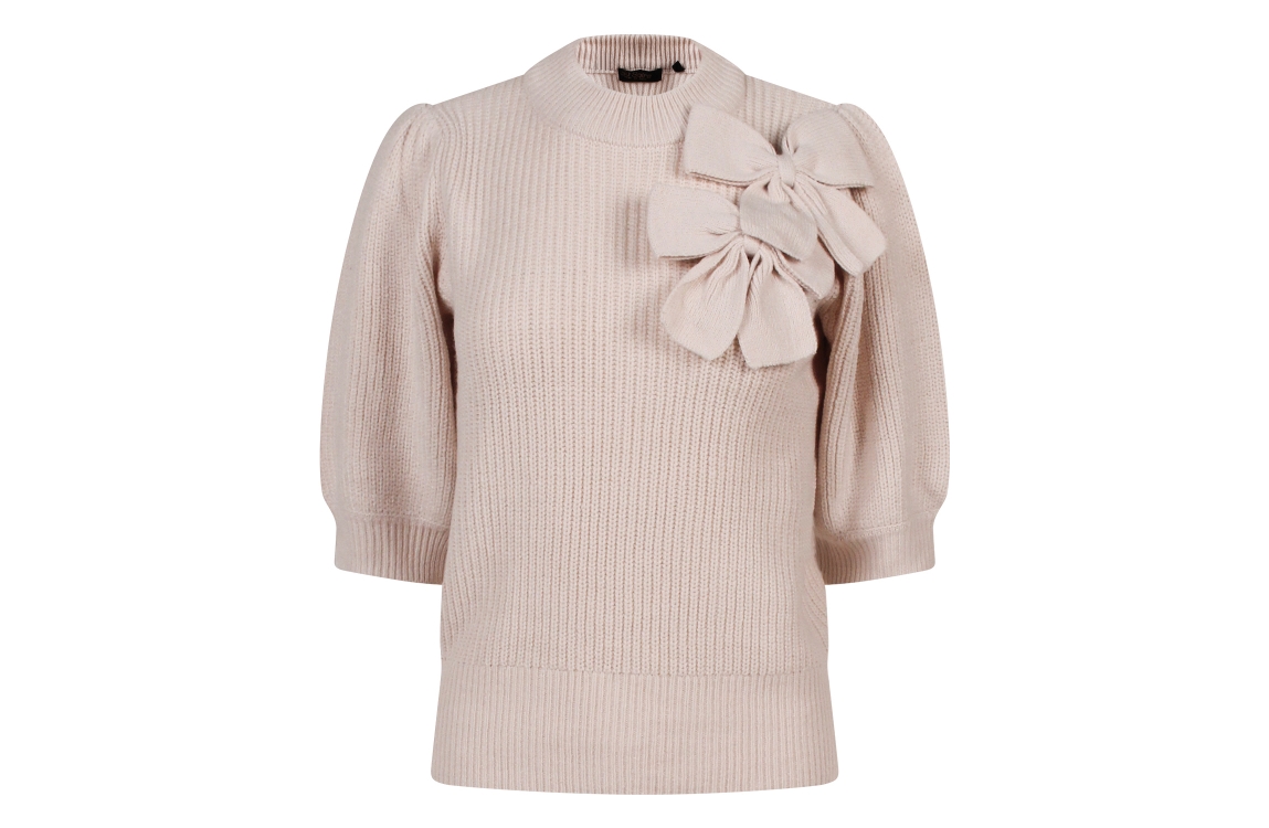 Omschrijving Acr/pol ribbrei, korte pofmouw, strikken