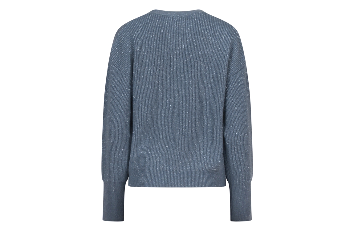 Omschrijving Acr/ny/pol/lurex, ribbrei, kort model, v-hals