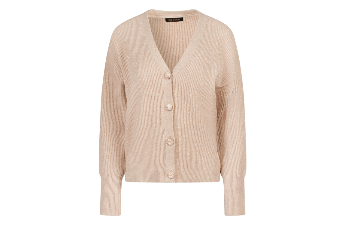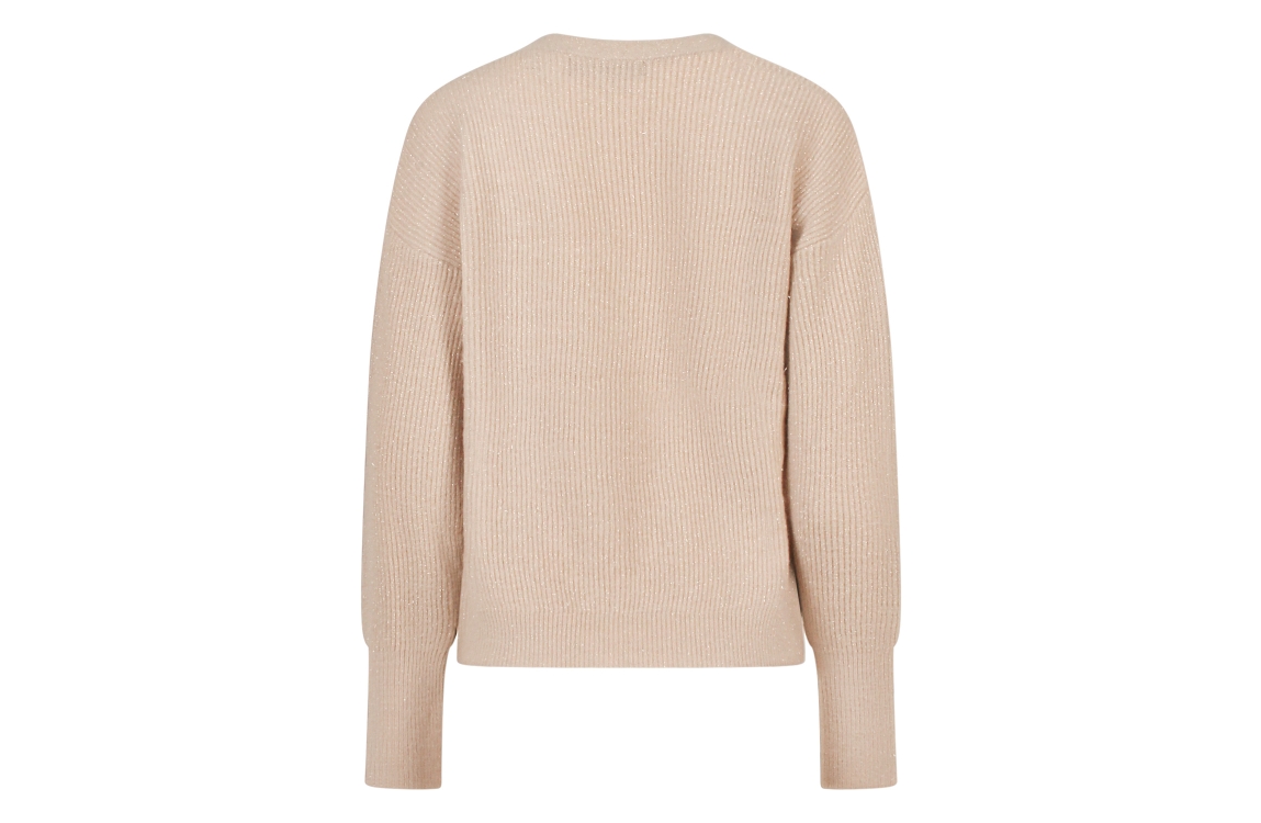 Omschrijving Acr/ny/pol/lurex, ribbrei, kort model, v-hals