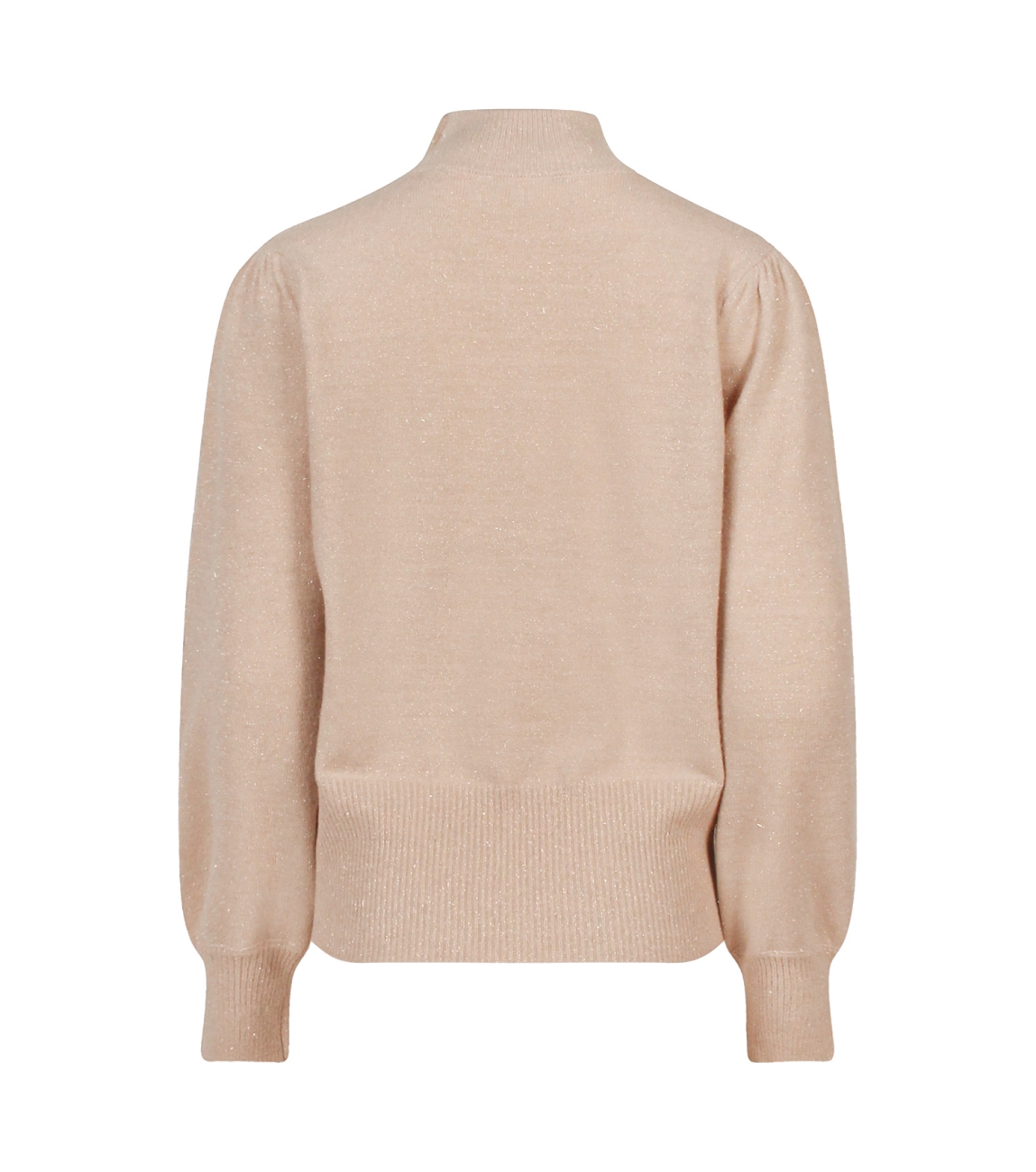 Omschrijving | Brei met lurex, opstaande kraag, fancy knopen |