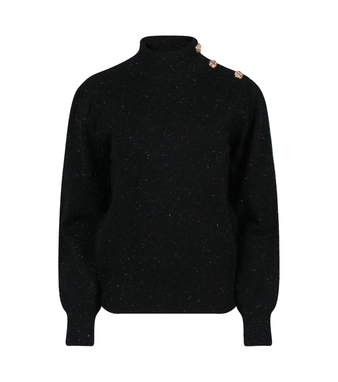 Omschrijving | Brei met lurex, opstaande kraag, fancy knopen |