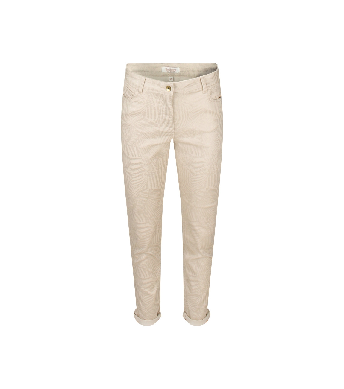 Omschrijving | Co/pol/el satin, folieprint, 5-pocket |