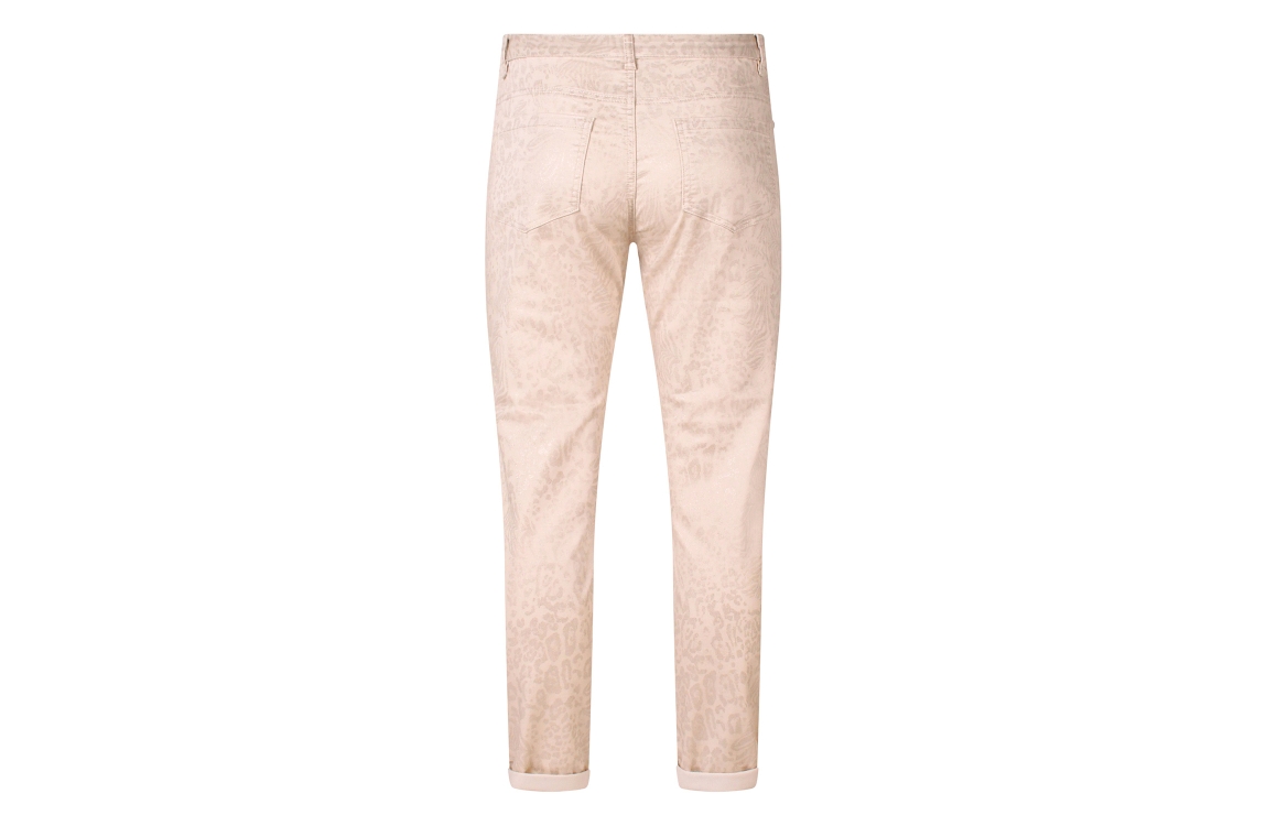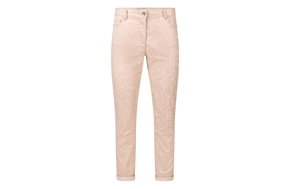 Omschrijving Co/pol/el satin, animal folieprint, 5-pocket