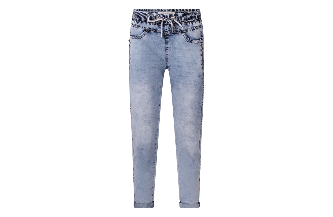 Omschrijving Denim, ritszakken, deelnaad, elastieke band