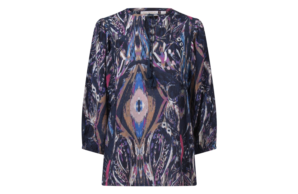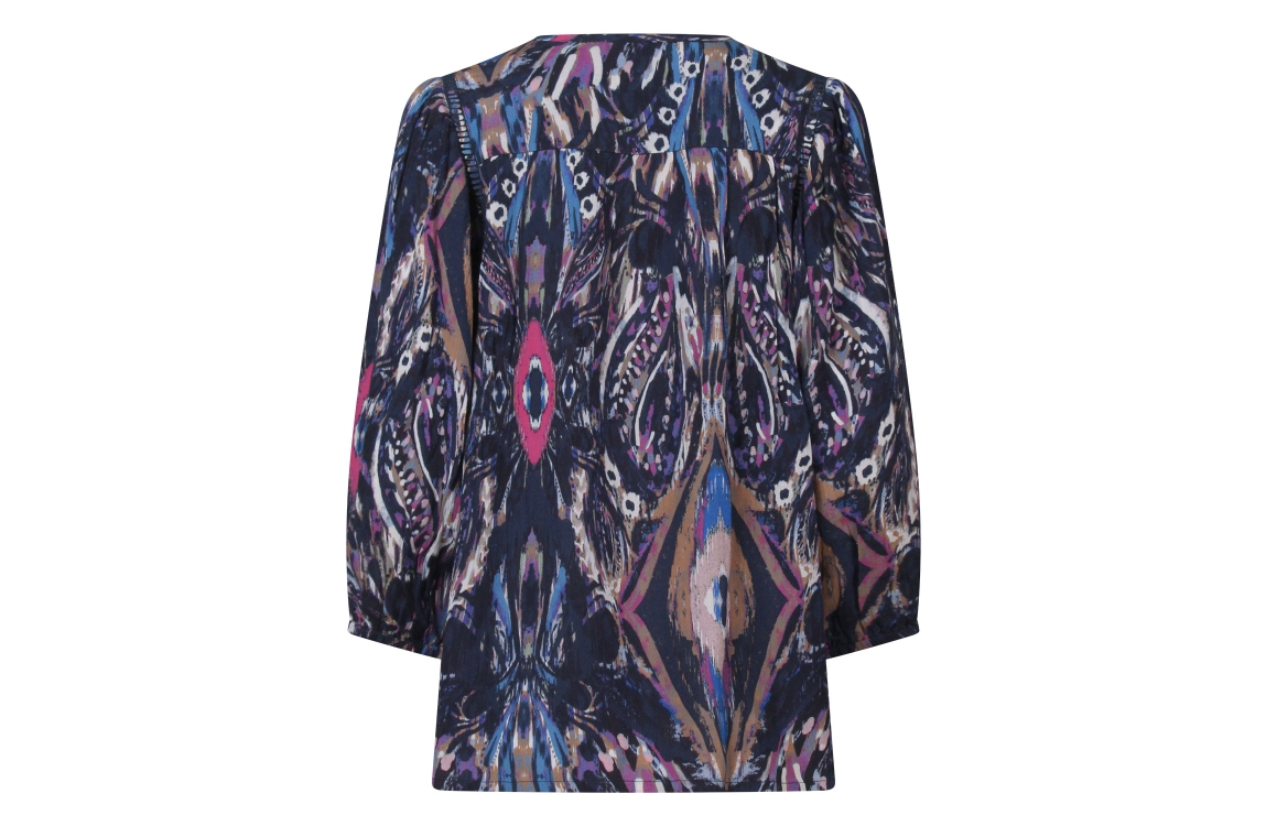 Omschrijving Rayon crepe, vegendessin, 3/4 mouw, kwastjes