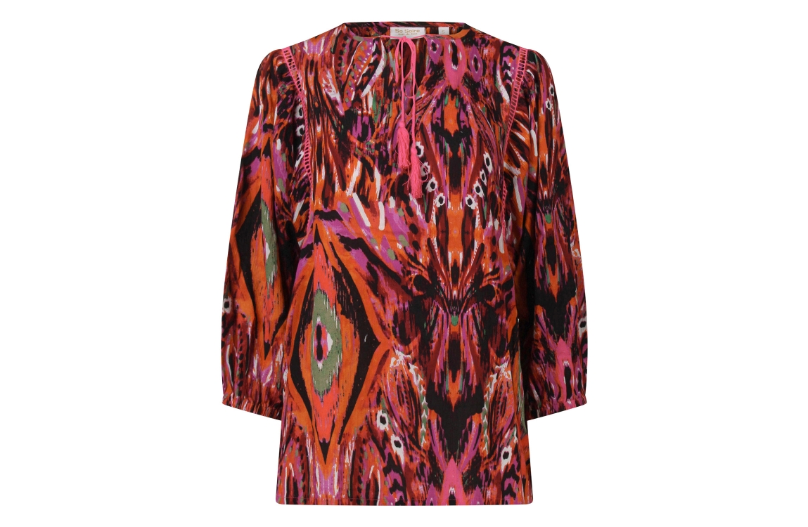 Omschrijving Rayon crepe, vegendessin, 3/4 mouw, kwastjes