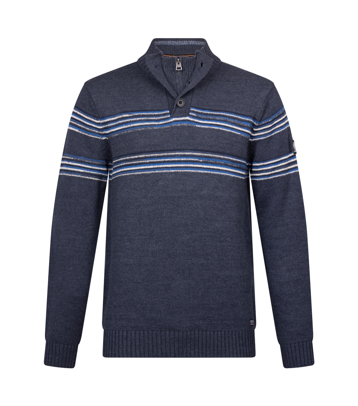 Omschrijving | Brei, melee strepen, dubbele kraag |