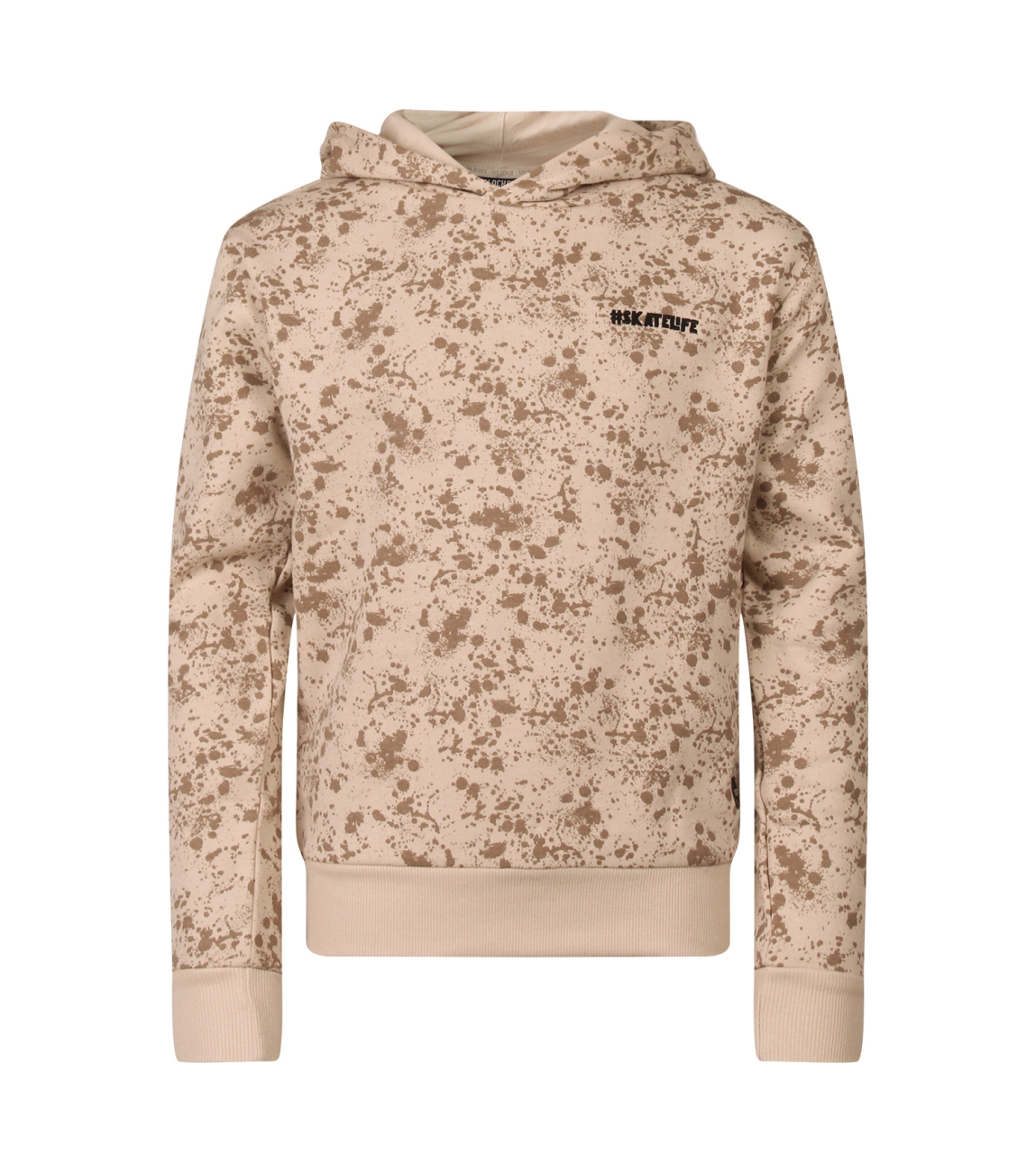 Omschrijving | Sweat, spetterprint, hood, tekstborduurtje |